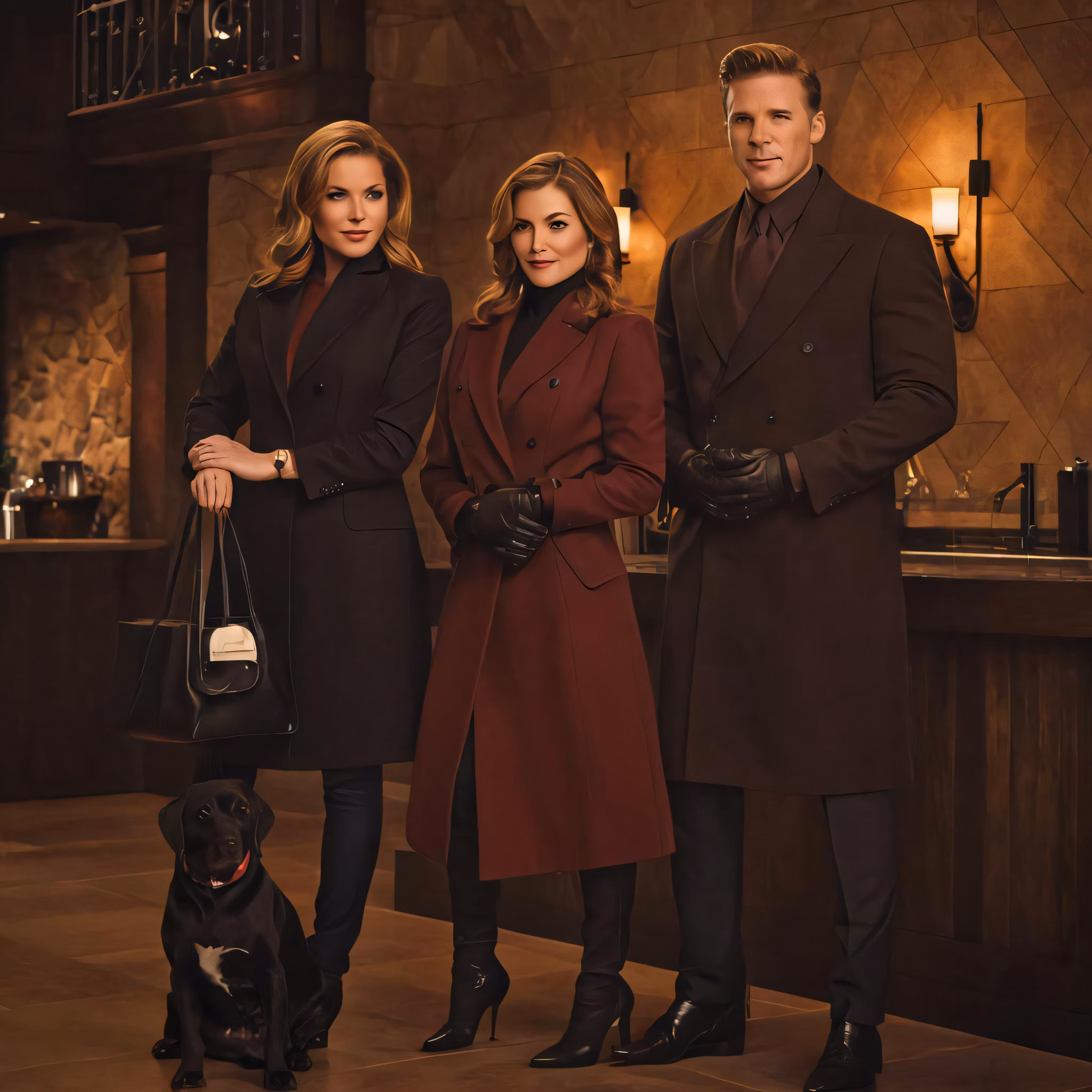 High resolution picture, free to use, two men and a woman in business suits standing side by side with their dog