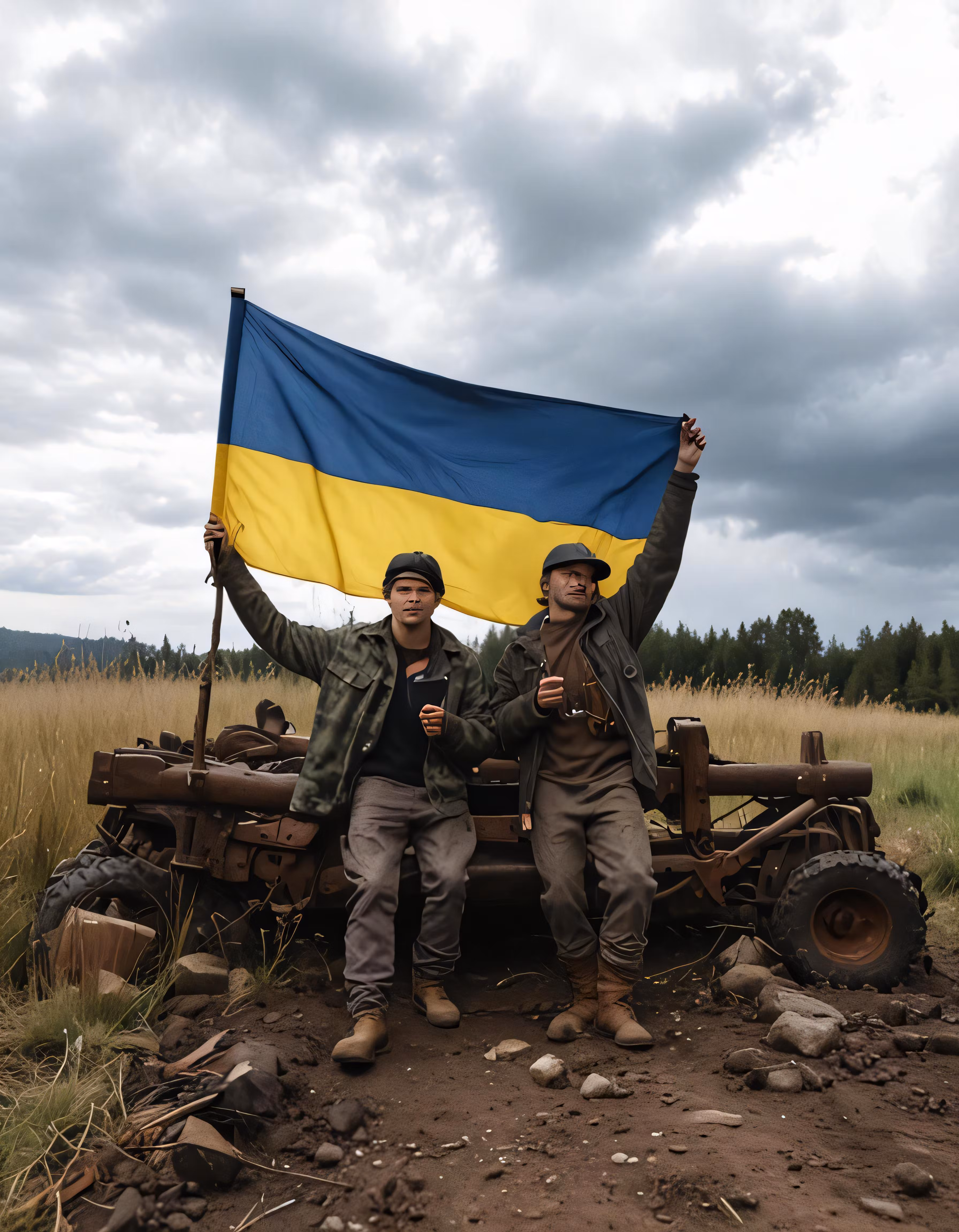 High resolution picture, free to use, two men holding up a flag standing by a truck