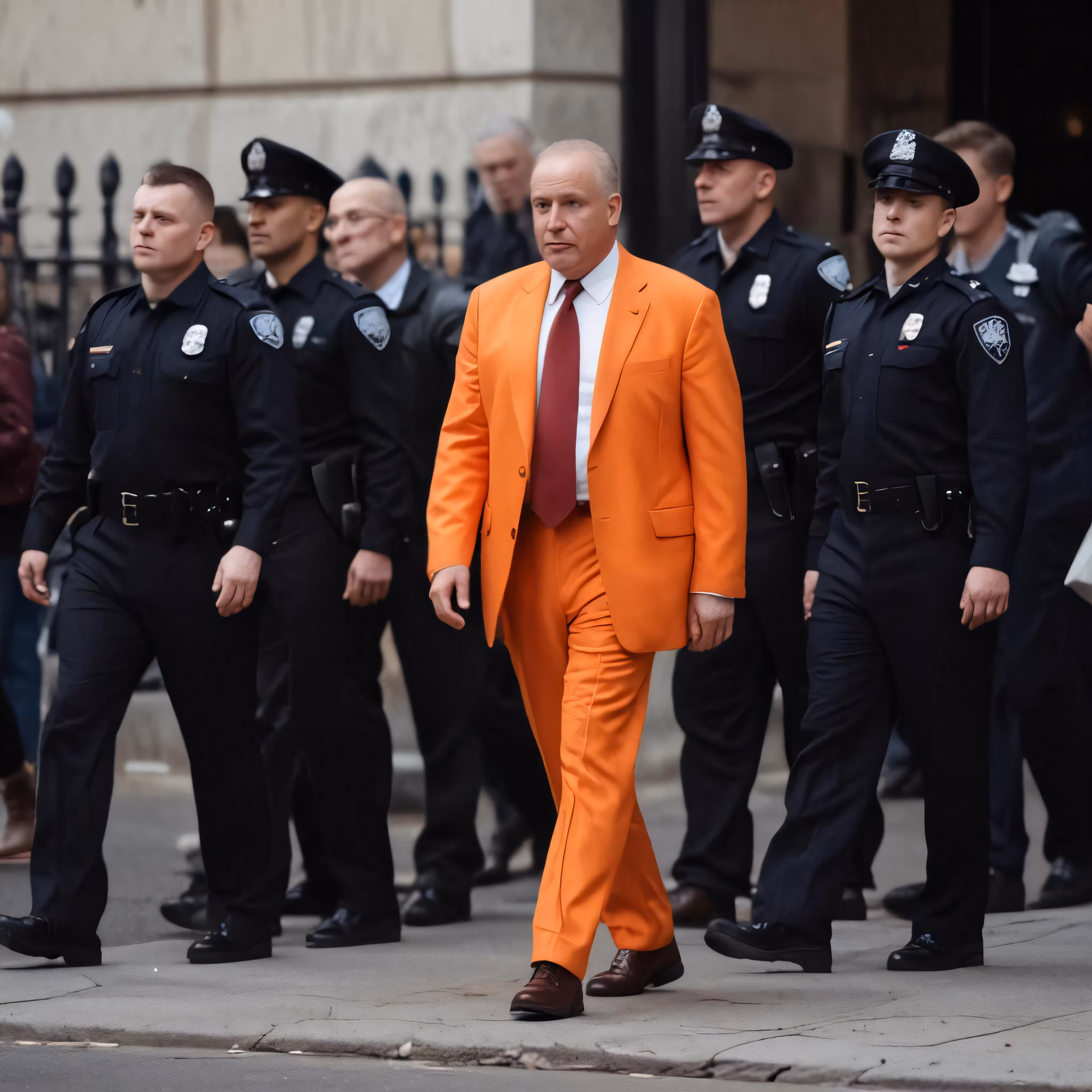 High resolution picture, free to use, two men in orange suits and police officers walking by