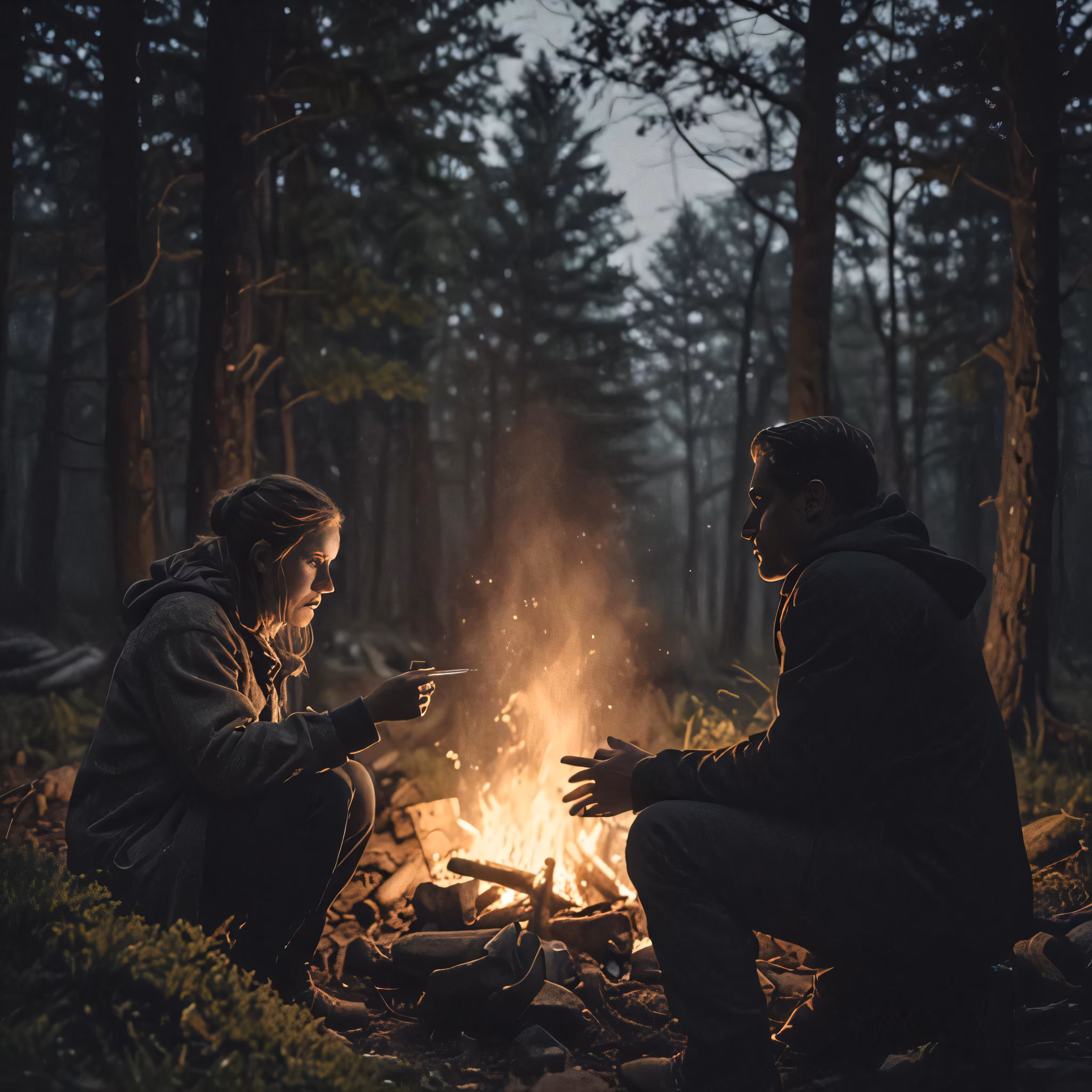 High resolution picture, free to use, two men sitting in the woods near a campfire and smoking a cigarette