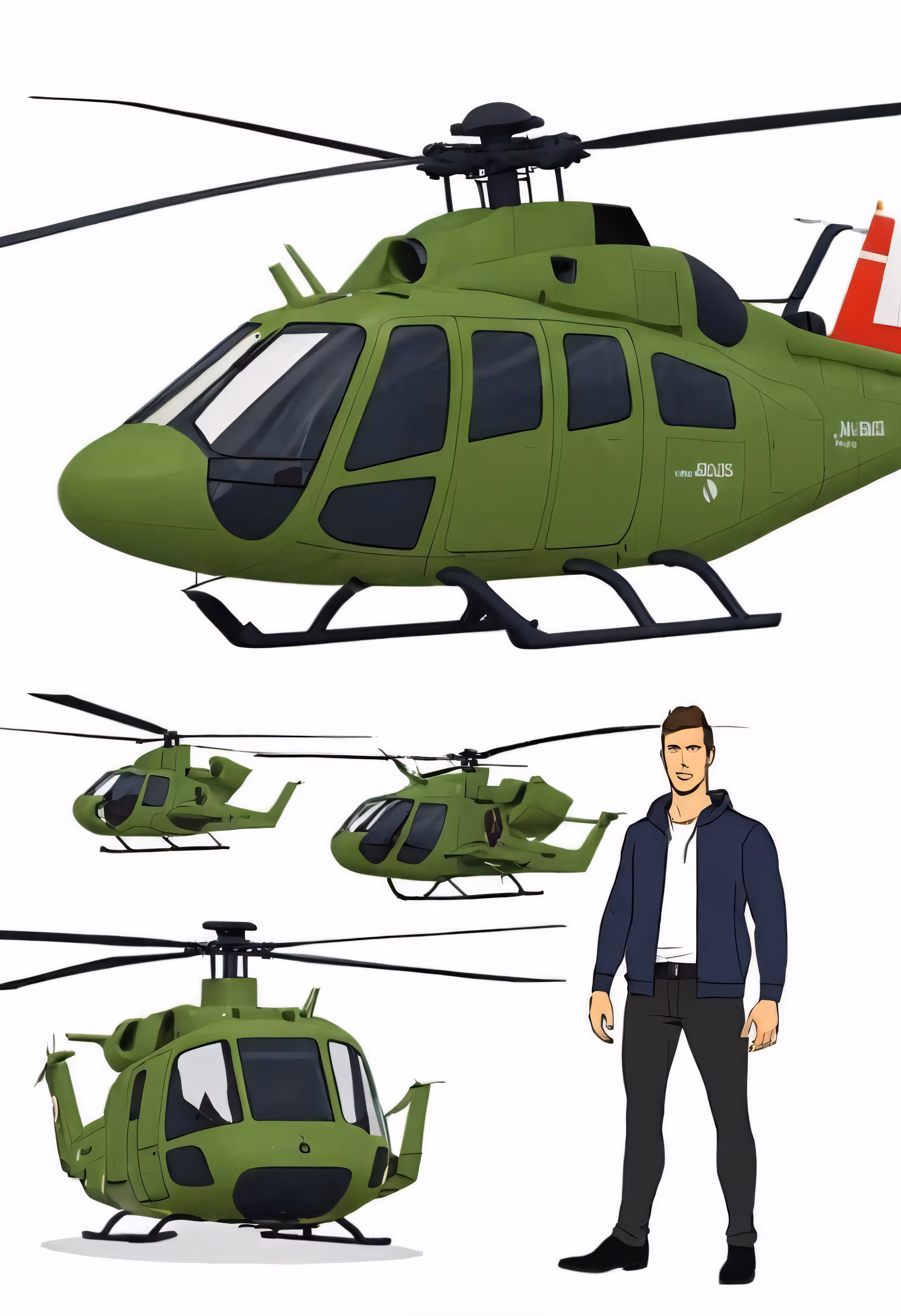 High resolution picture, free to use, two men standing next to a green helicopter