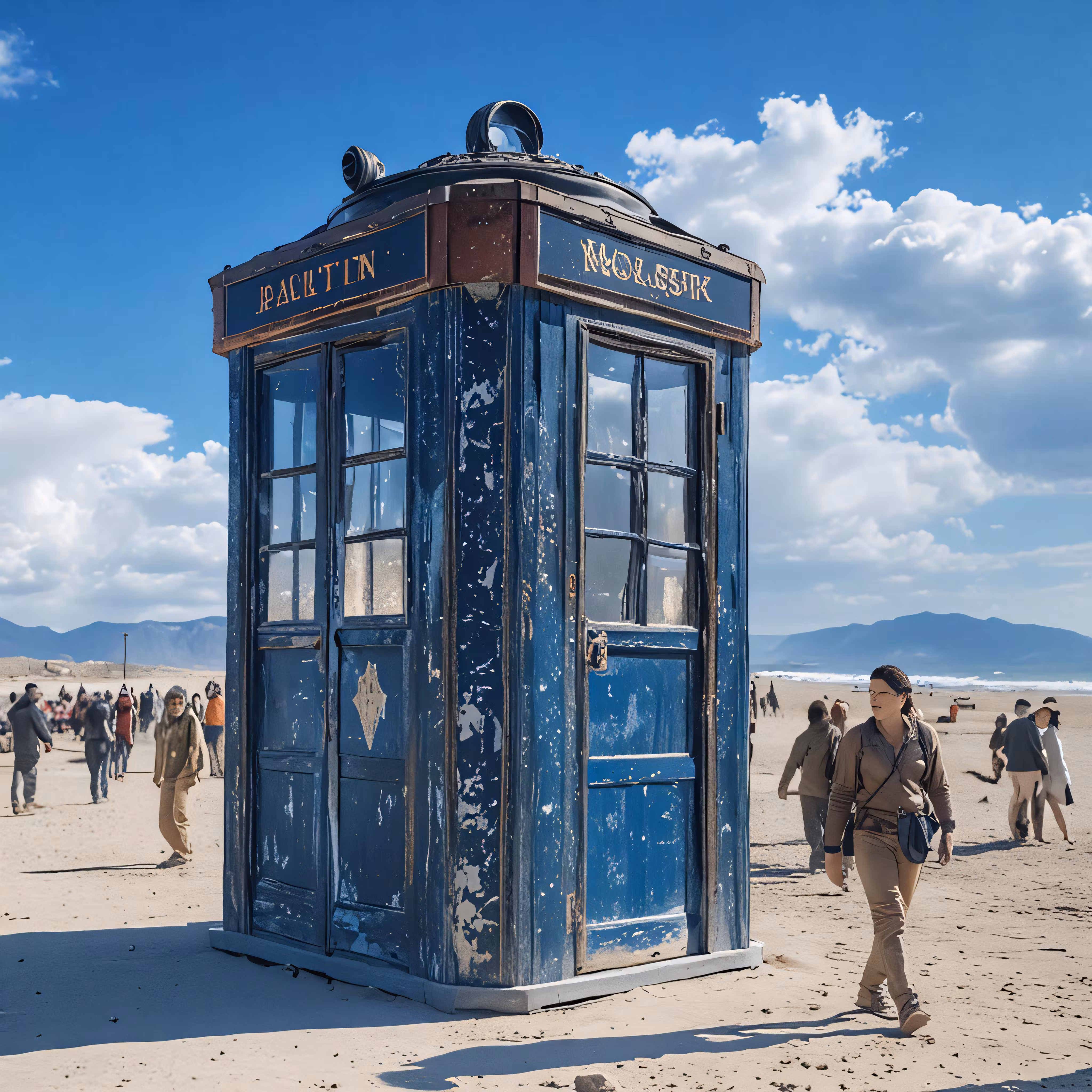 High resolution picture, free to use, two men walking on the beach in front of a small blue phone booth