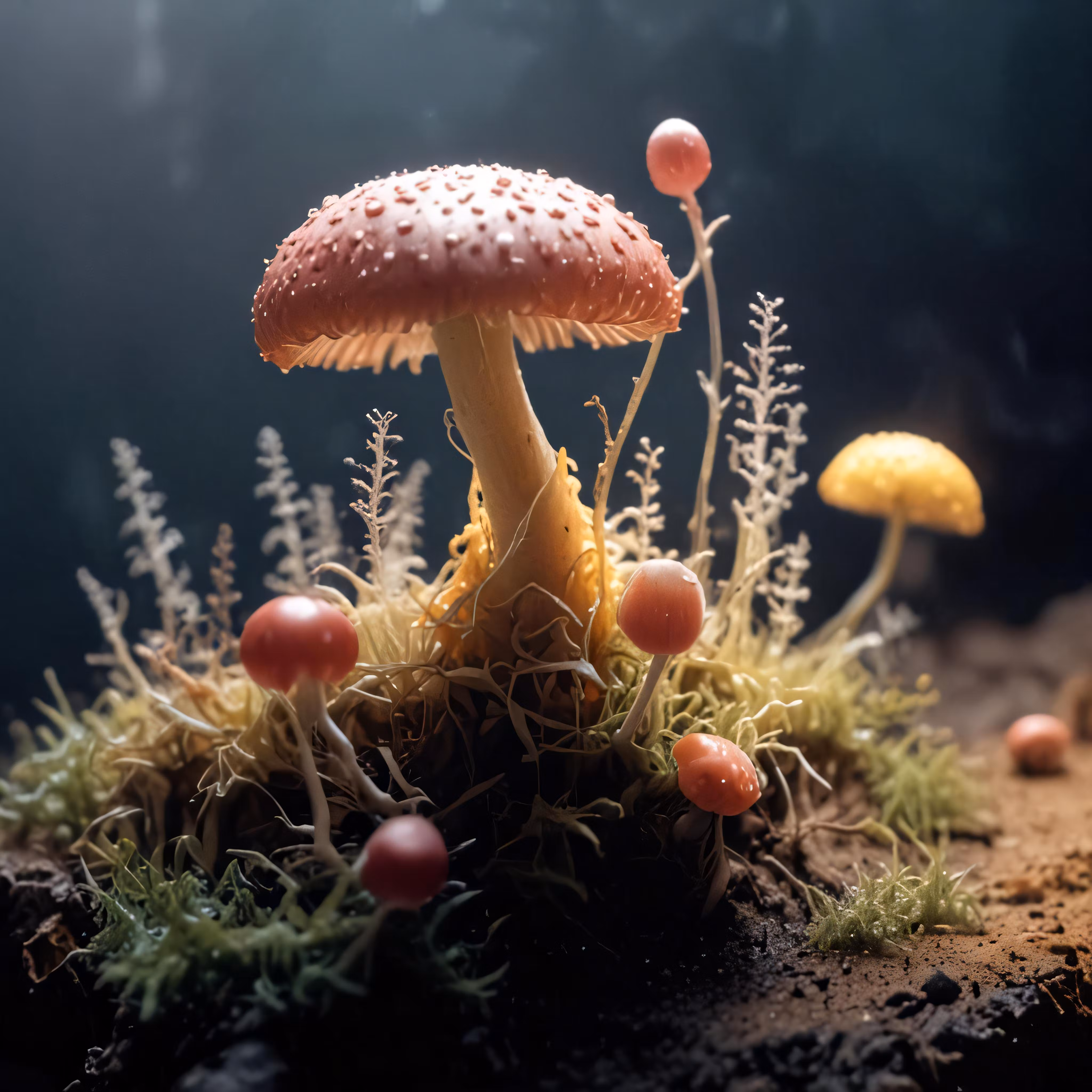 High resolution picture, free to use, two mushrooms growing on the mossy ground