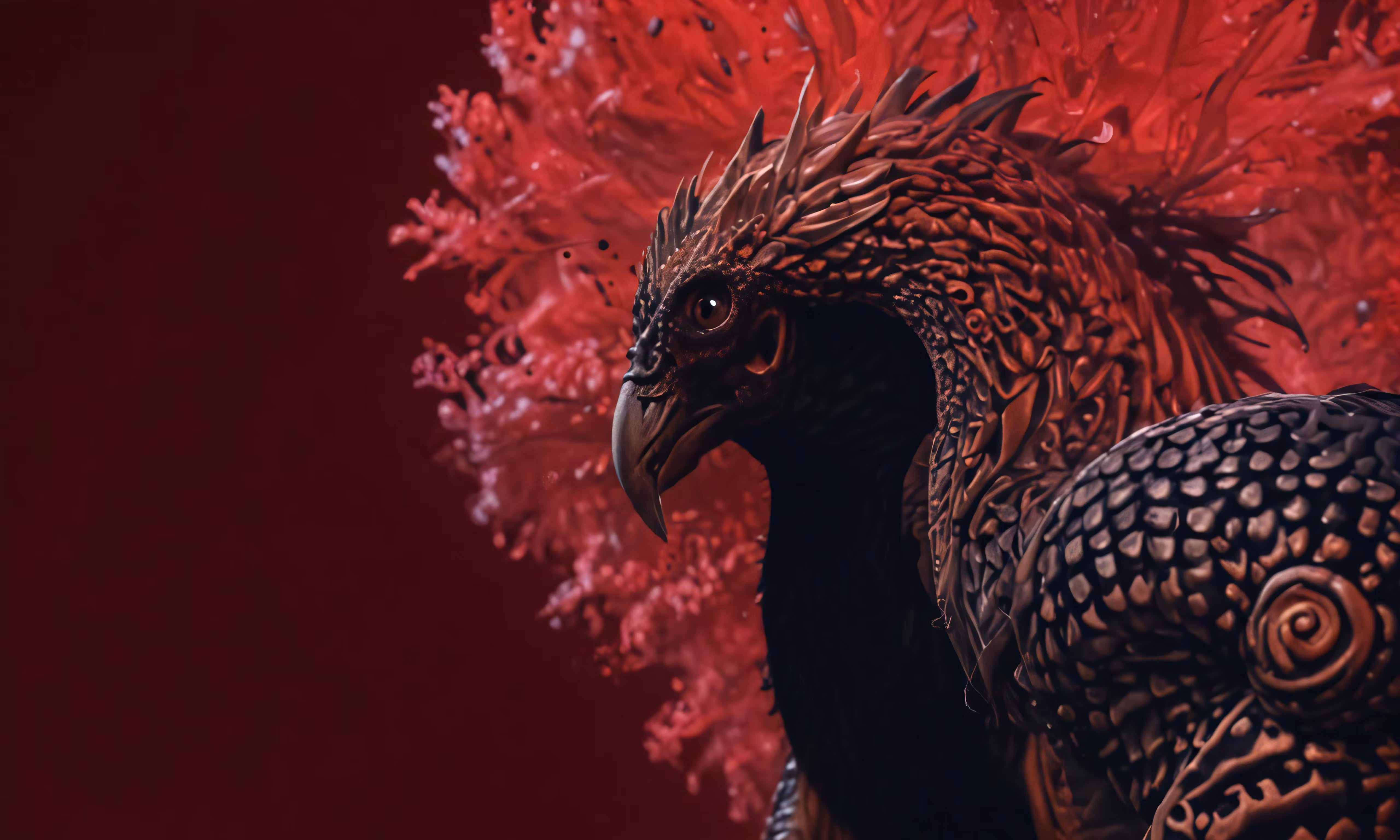 High resolution picture, free to use, two ornate black birds with red feathers standing together