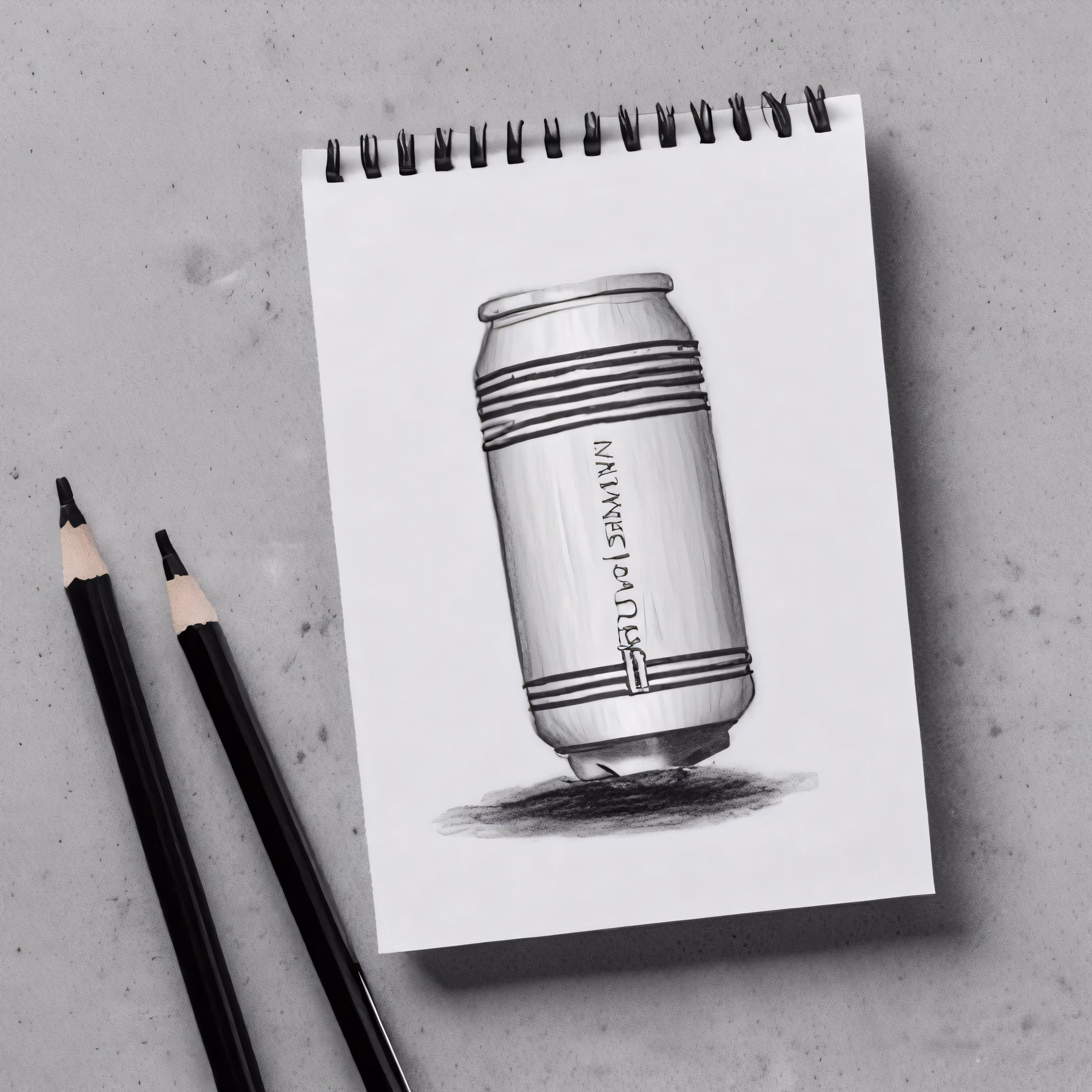 High resolution picture, free to use, two pencils sit on top of a spiral notebook that shows a picture of a beverage can and a pencil