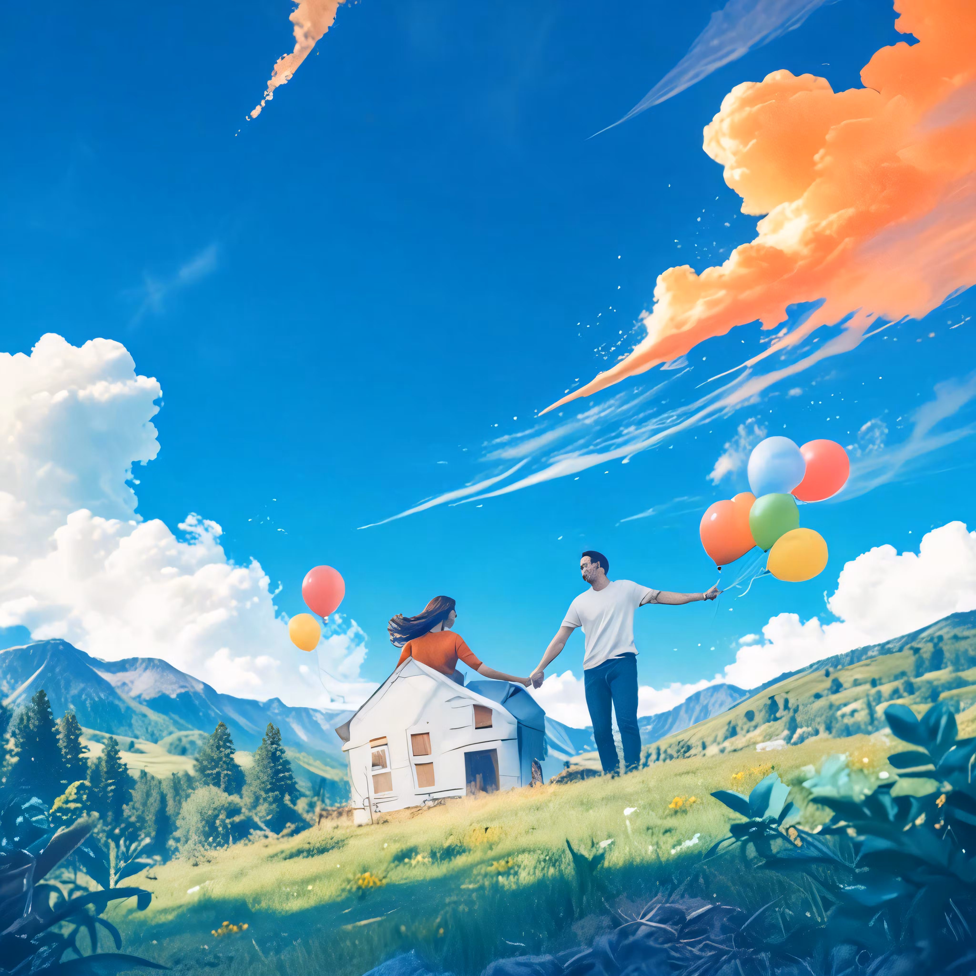 High resolution picture, free to use, two people are holding hands in a field with many balloons