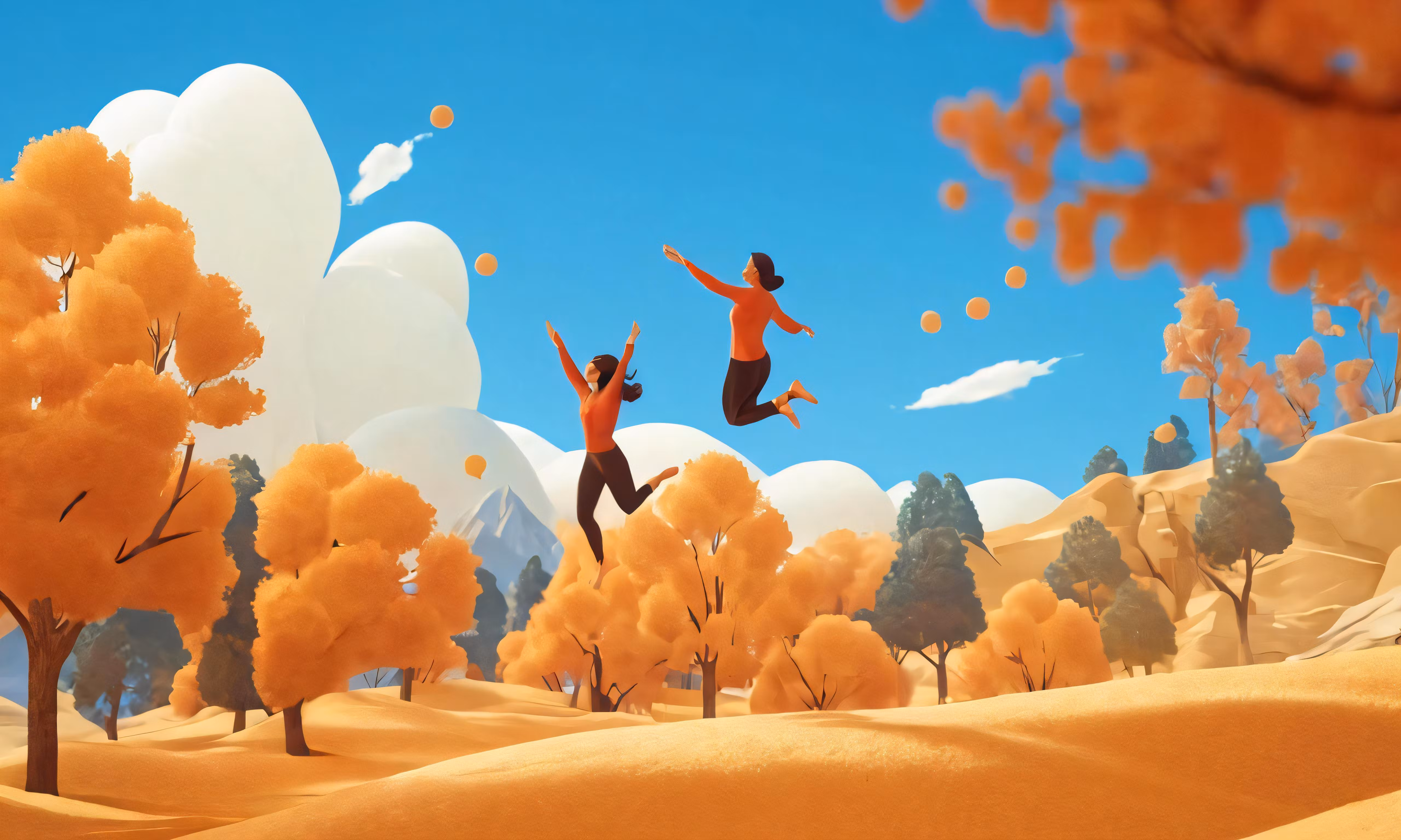High resolution picture, free to use, two people are jumping on a hill surrounded by trees