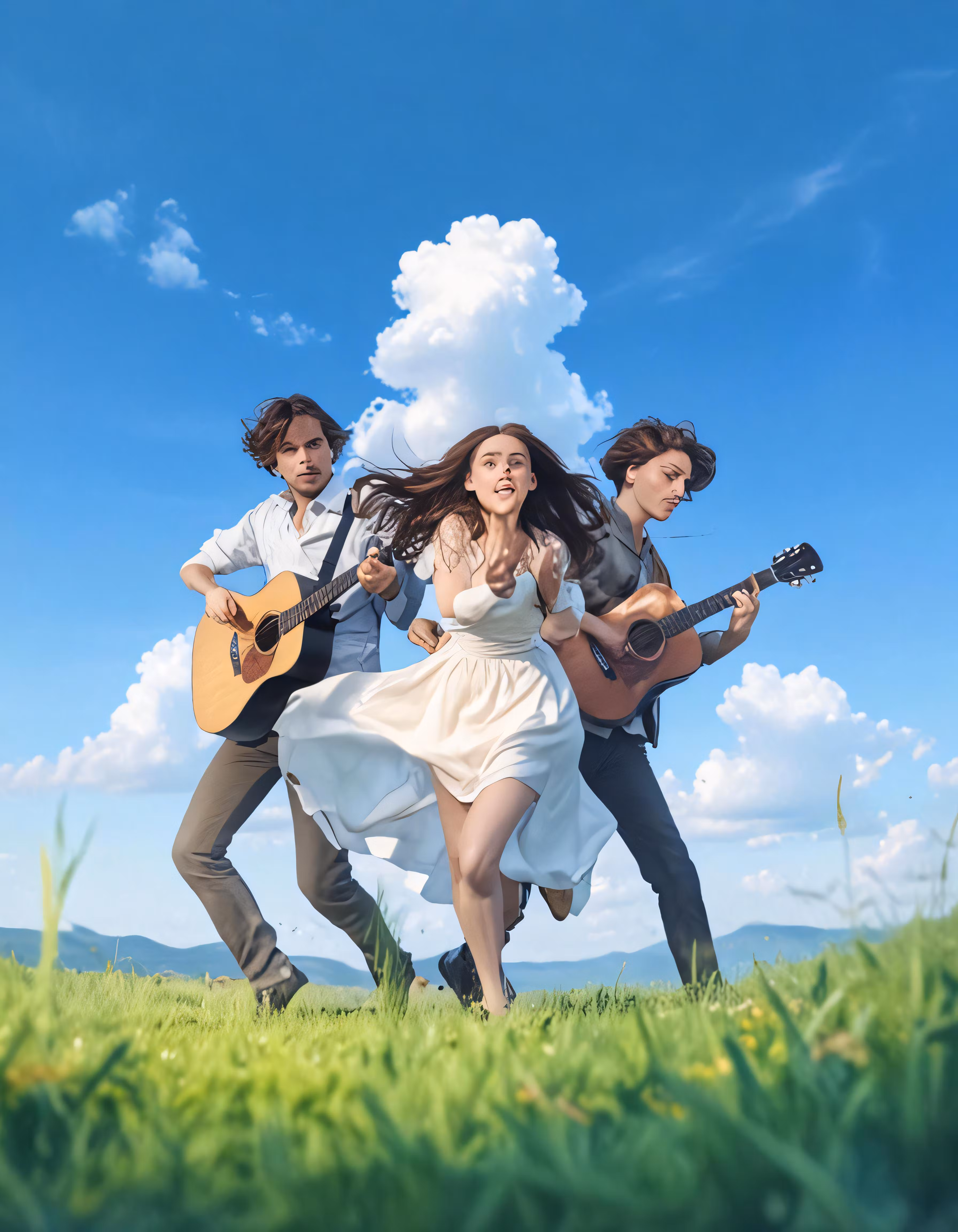 High resolution picture, free to use, two people are standing in a field playing the guitar