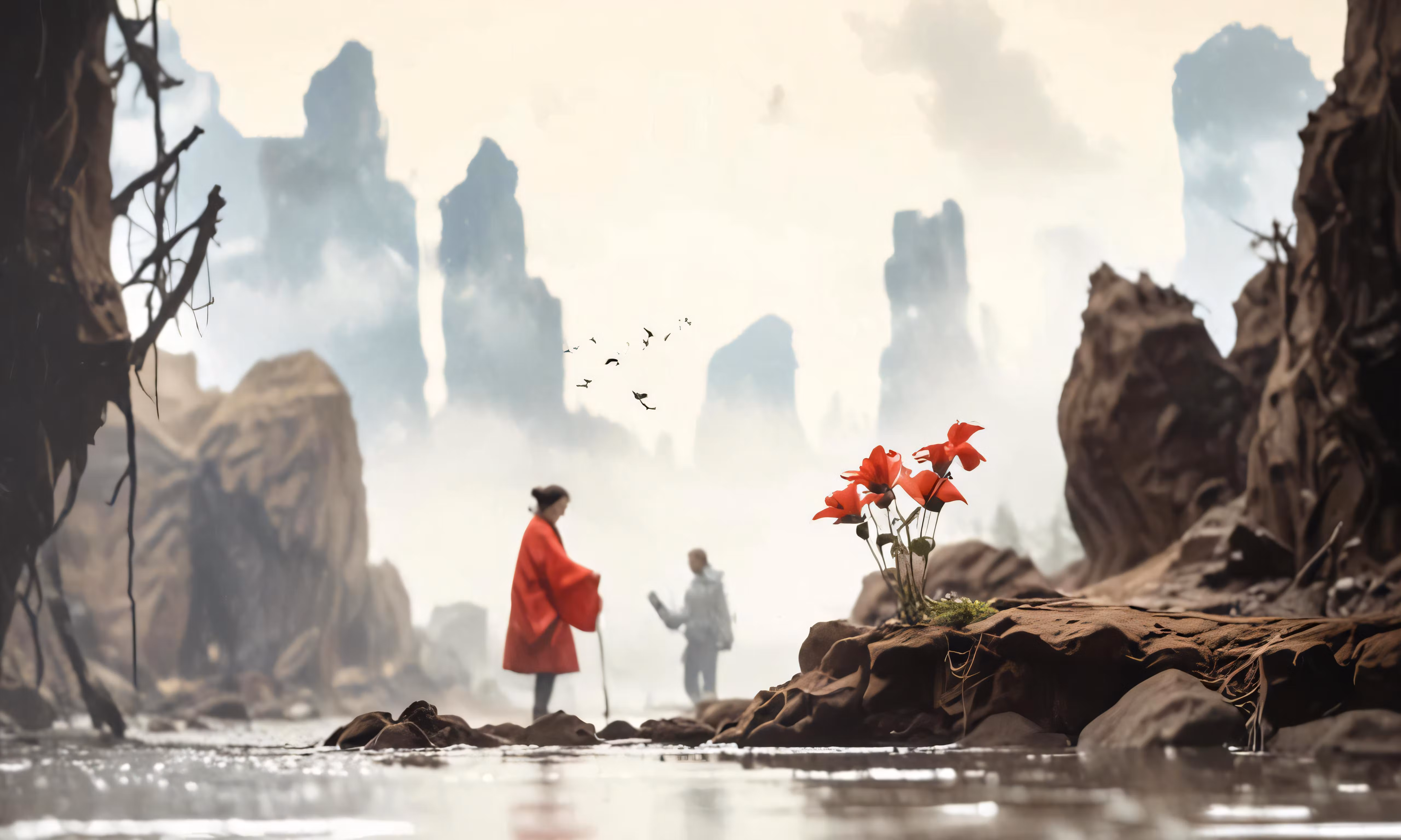 High resolution picture, free to use, two people are standing on some rocks in the water