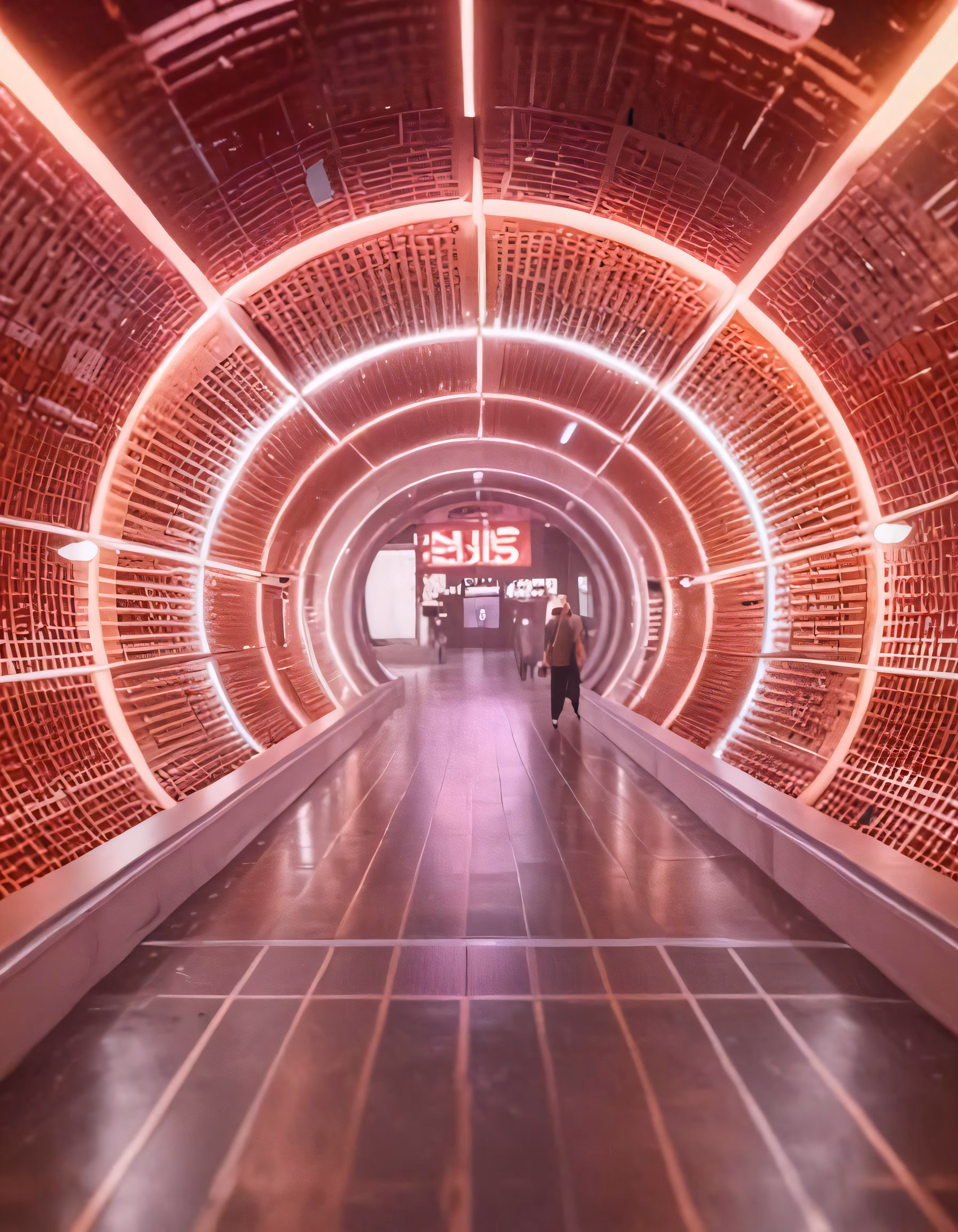 High resolution picture, free to use, two people are walking in a tunnel under a clock