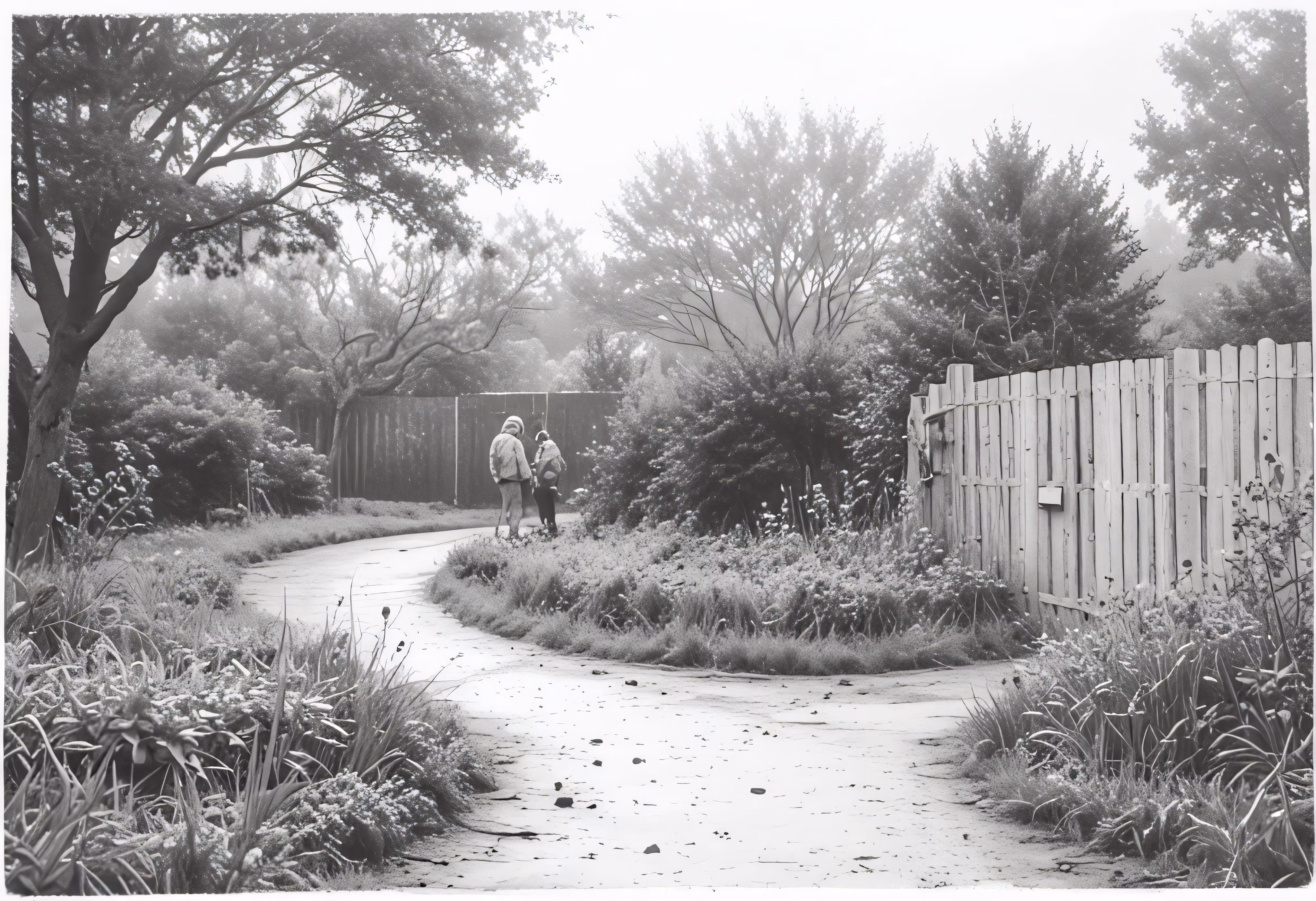 High resolution picture, free to use, two people are walking on a path through a garden