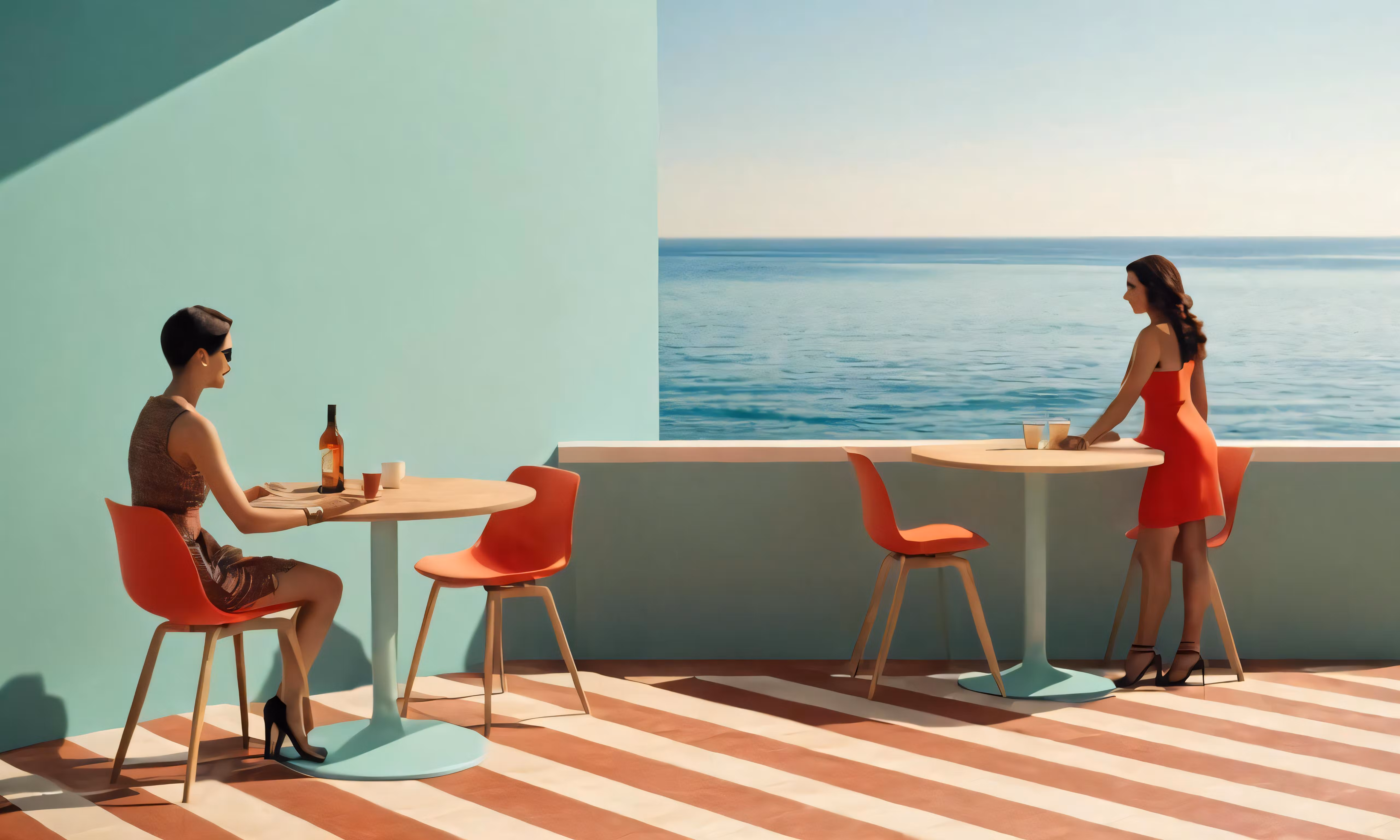 High resolution picture, free to use, two people at tables drinking beer on a beach