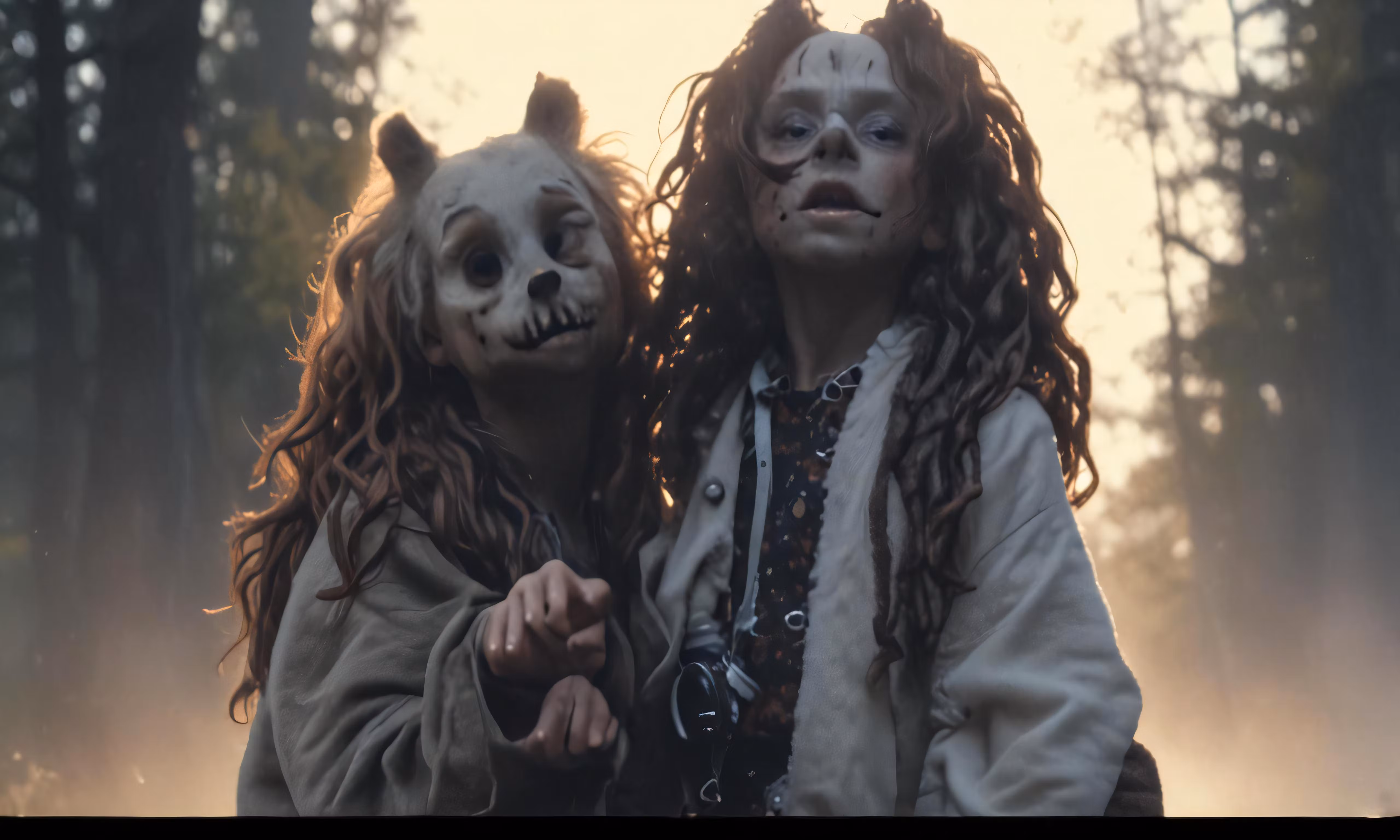 High resolution picture, free to use, two people in costumes with weird makeup in the woods