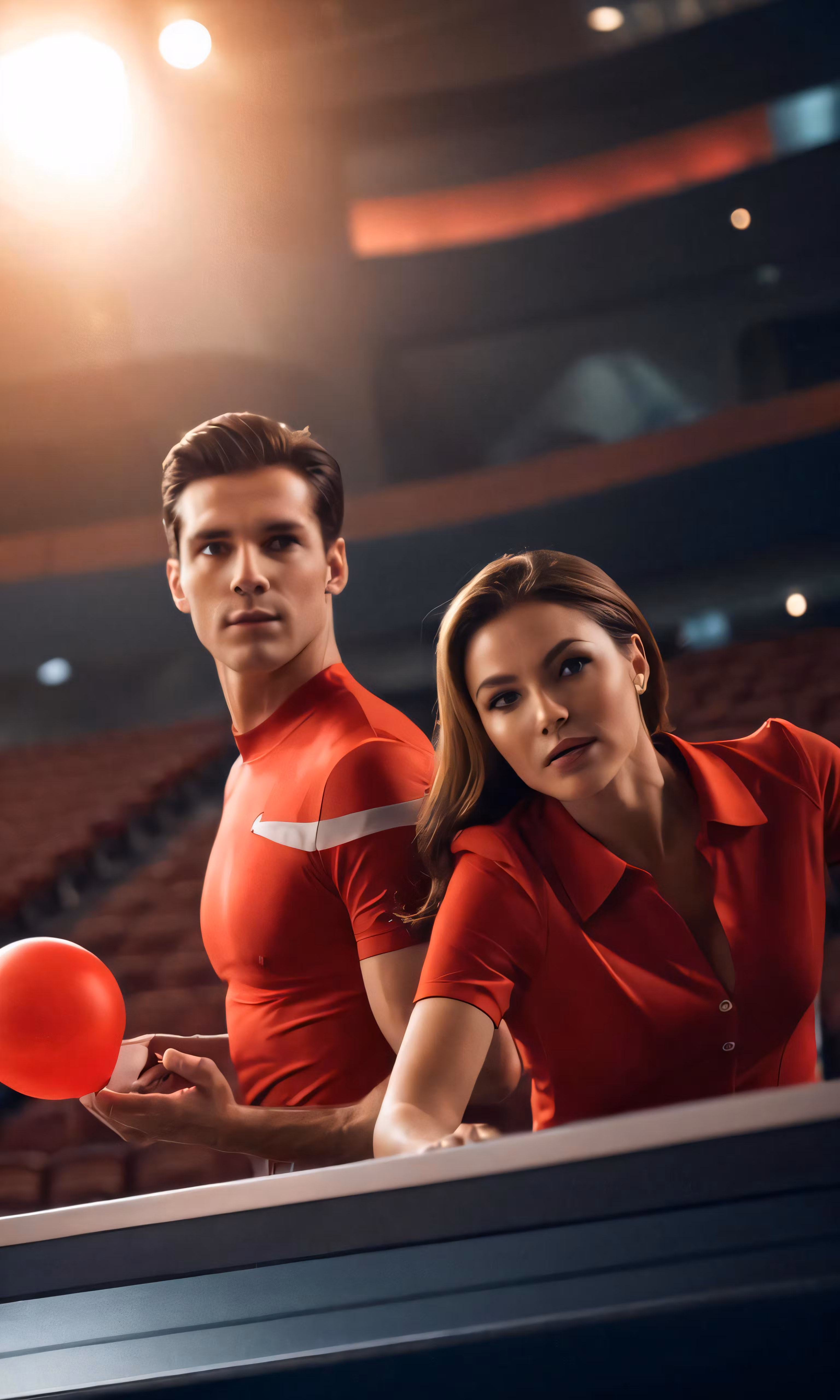 High resolution picture, free to use, two people in red shirts holding frisbees in front of a stadium