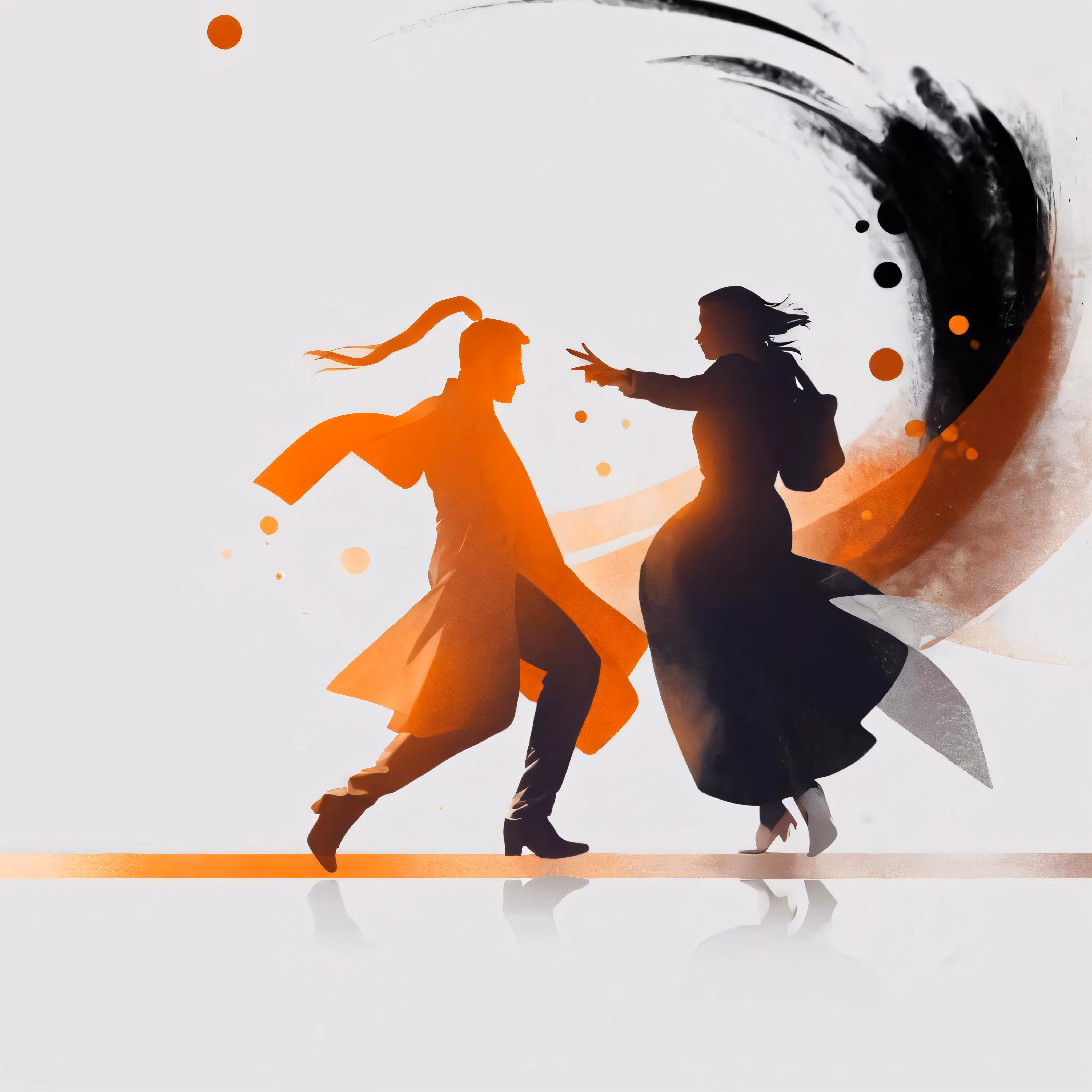 High resolution picture, free to use, two people in silhouette dancing in front of a bright orange sun