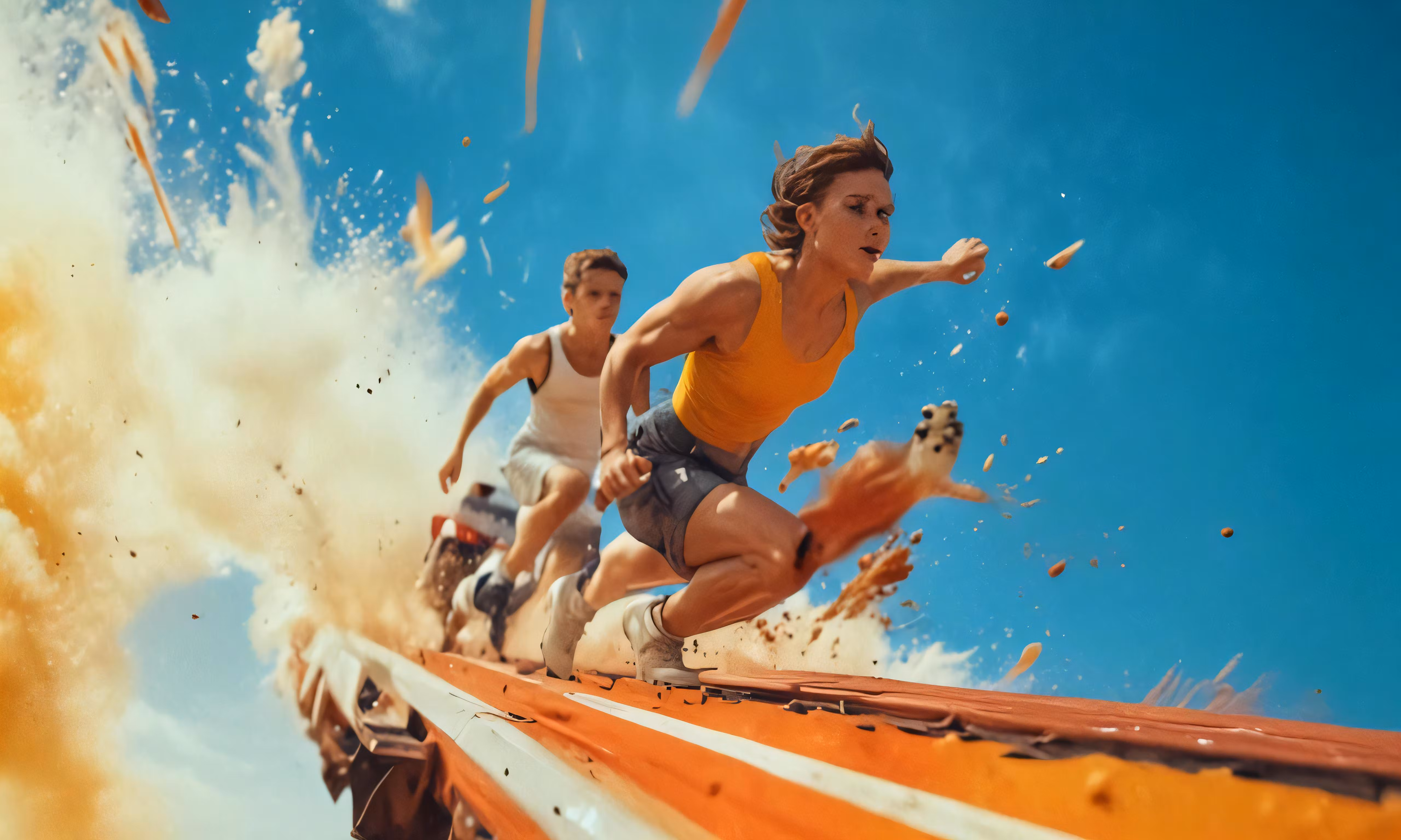 High resolution picture, free to use, two people racing across the air on their surf boards