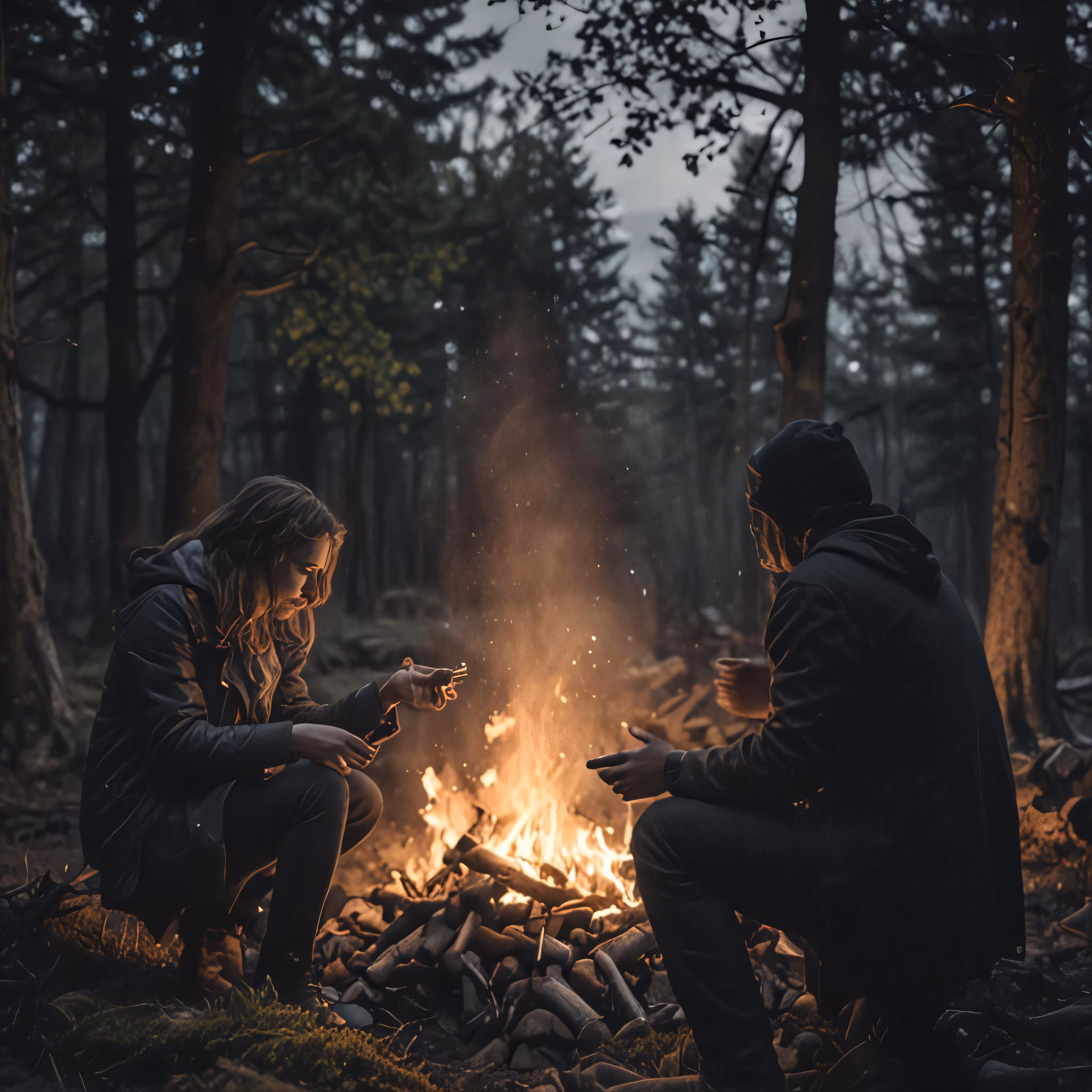 High resolution picture, free to use, two people sitting by the fire looking at their cell phones