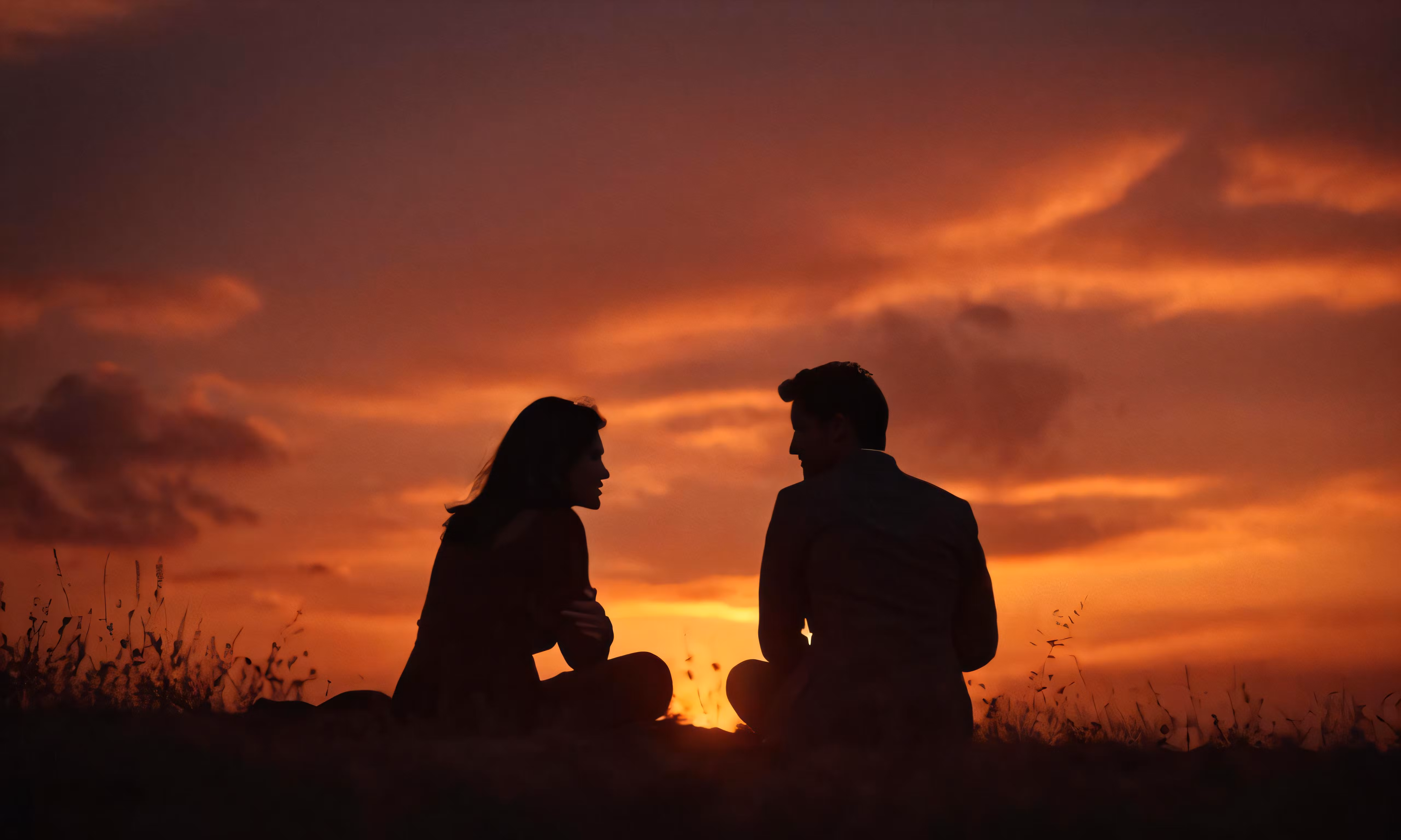 High resolution picture, free to use, two people sitting in the grass watching a sunset