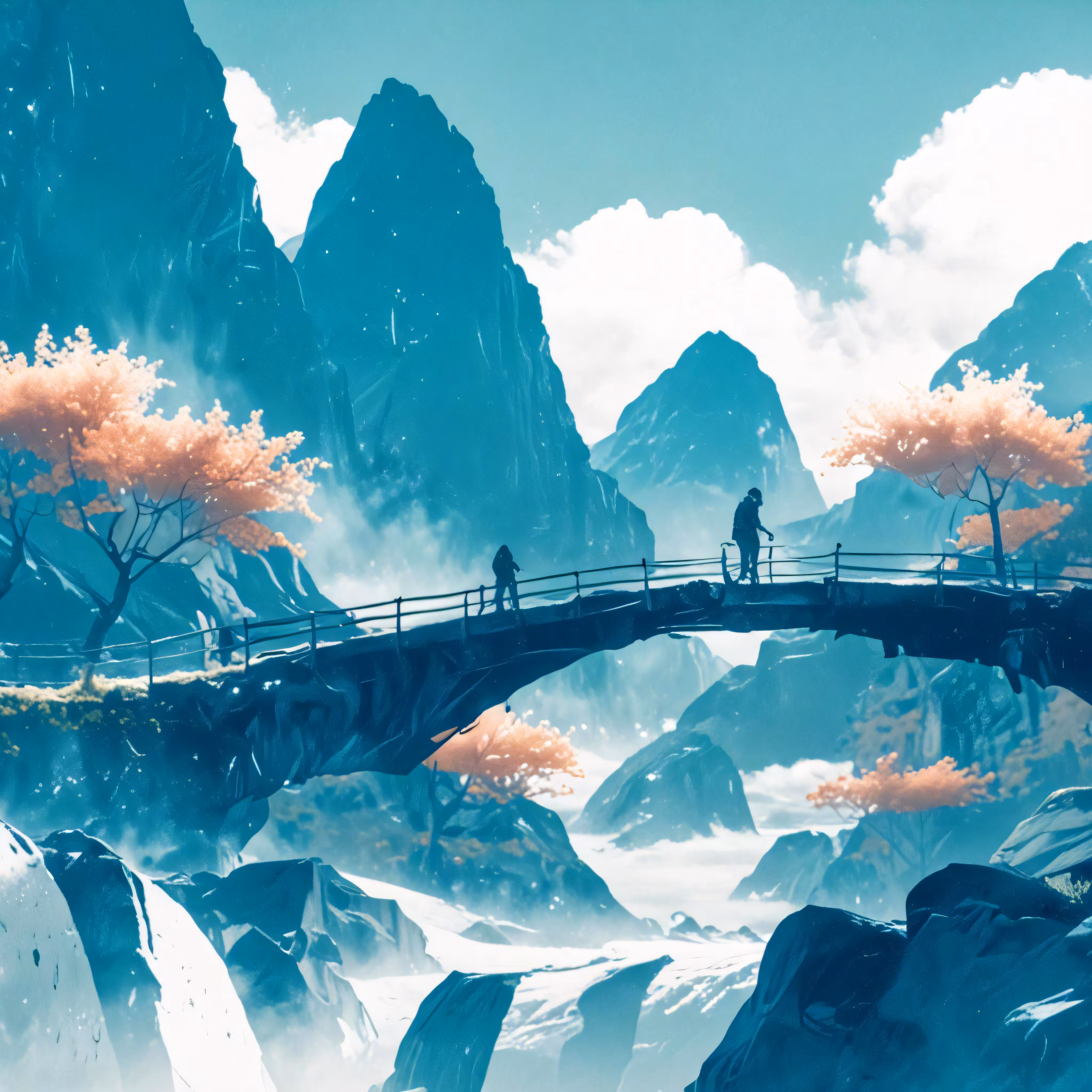 High resolution picture, free to use, two people stand on a bridge over a snowy valley