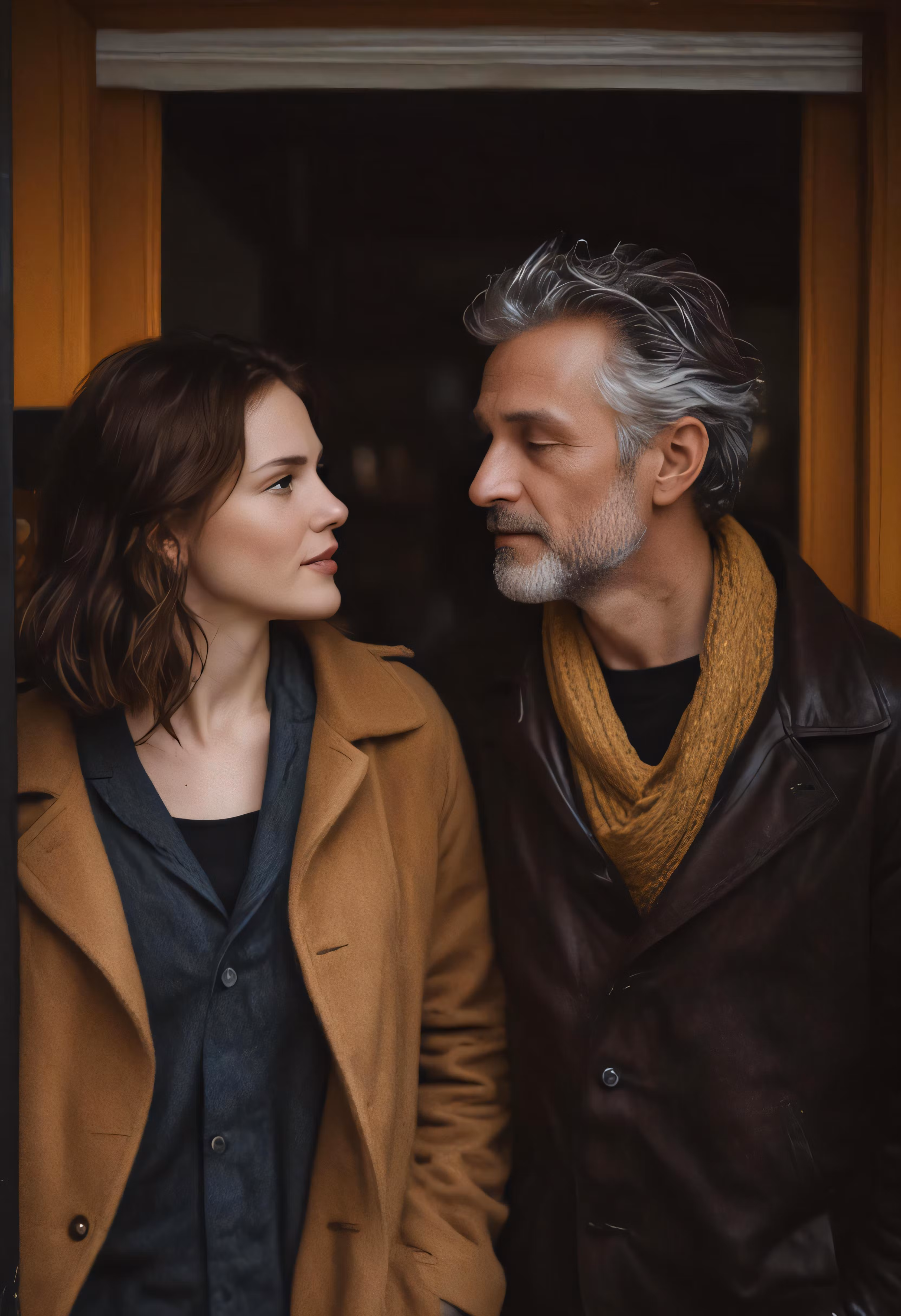 High resolution picture, free to use, two people standing next to each other in front of a building