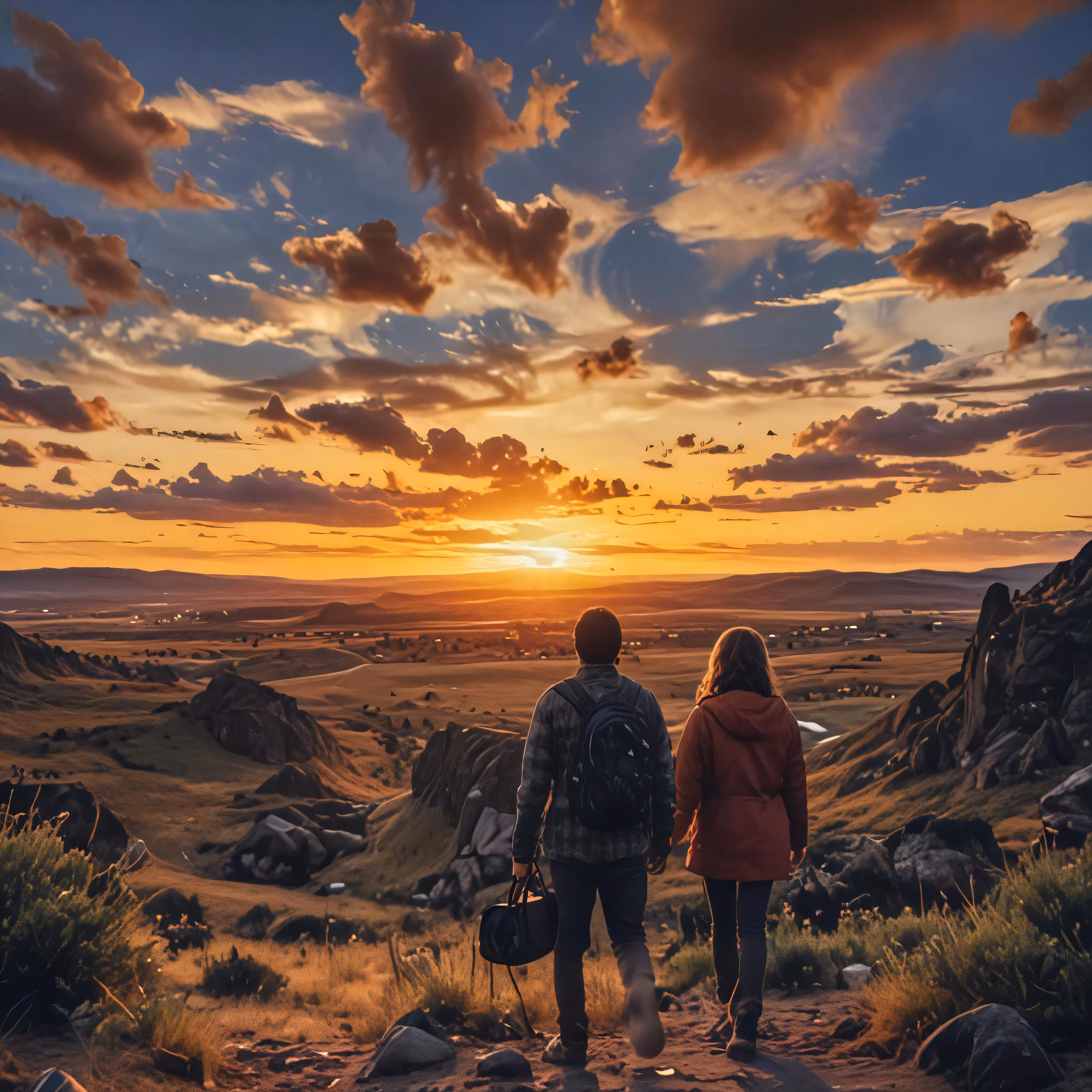 High resolution picture, free to use, two people standing on a hill as the sun sets