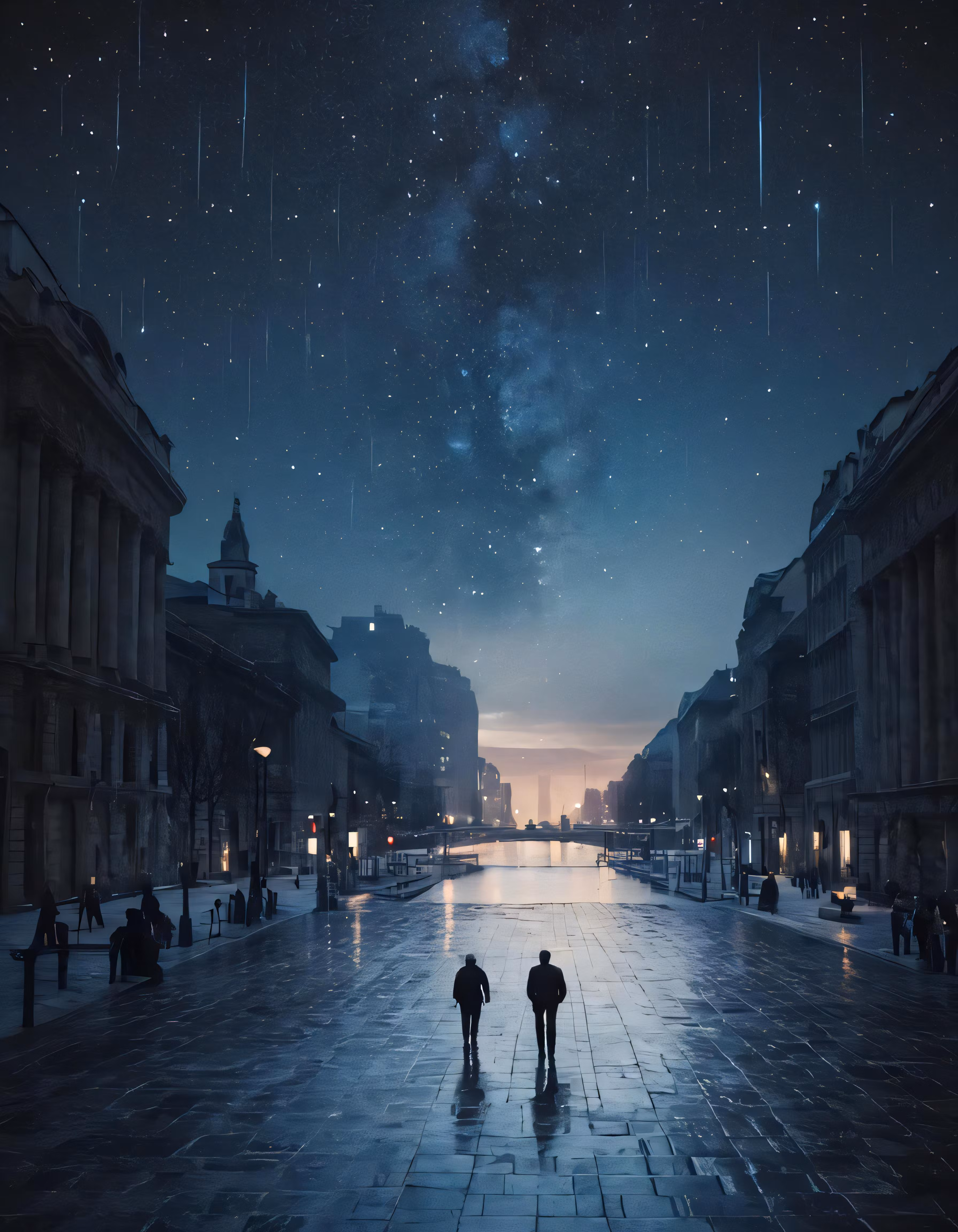 High resolution picture, free to use, two people walk through an empty street at night
