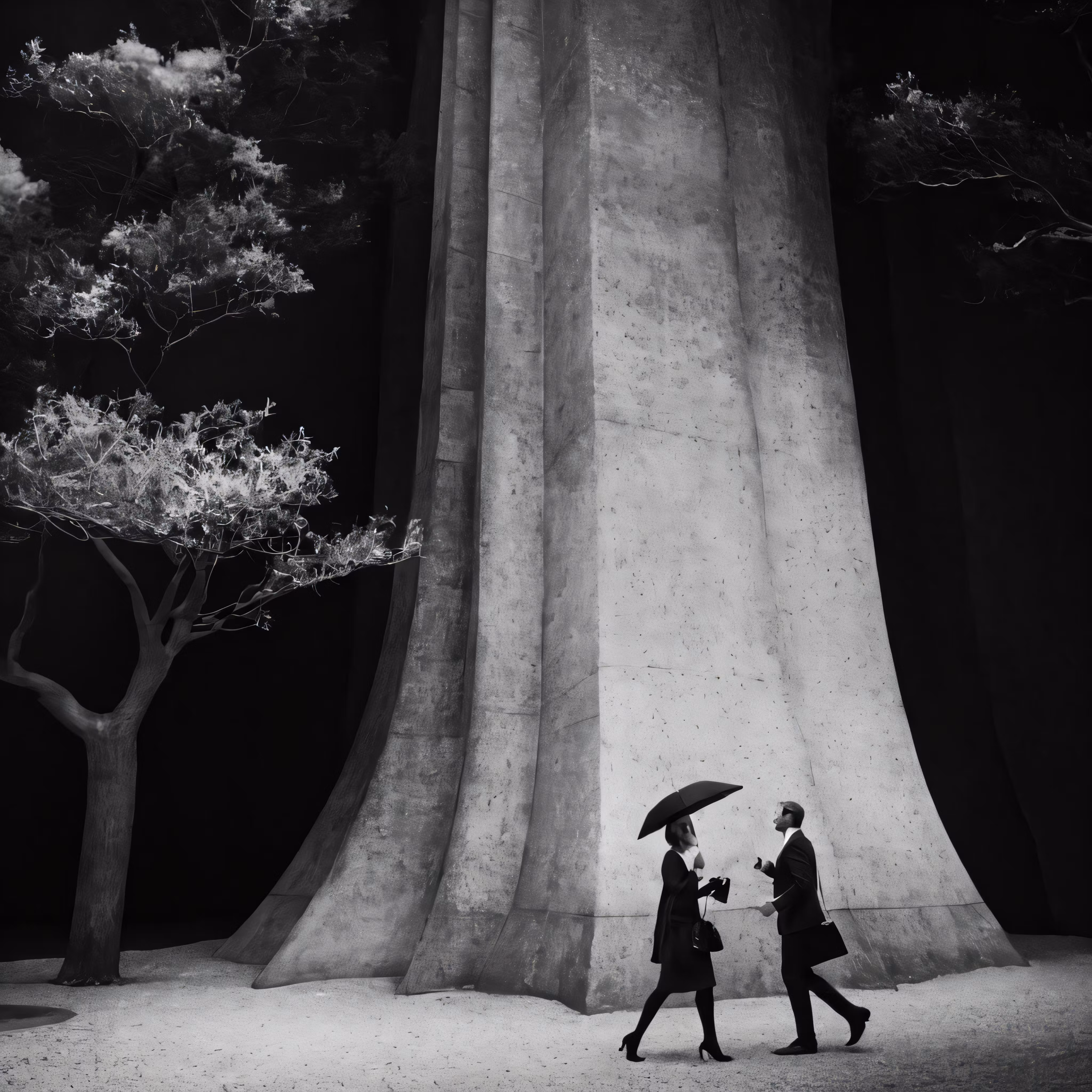 High resolution picture, free to use, two people walking past a giant monument holding an umbrella