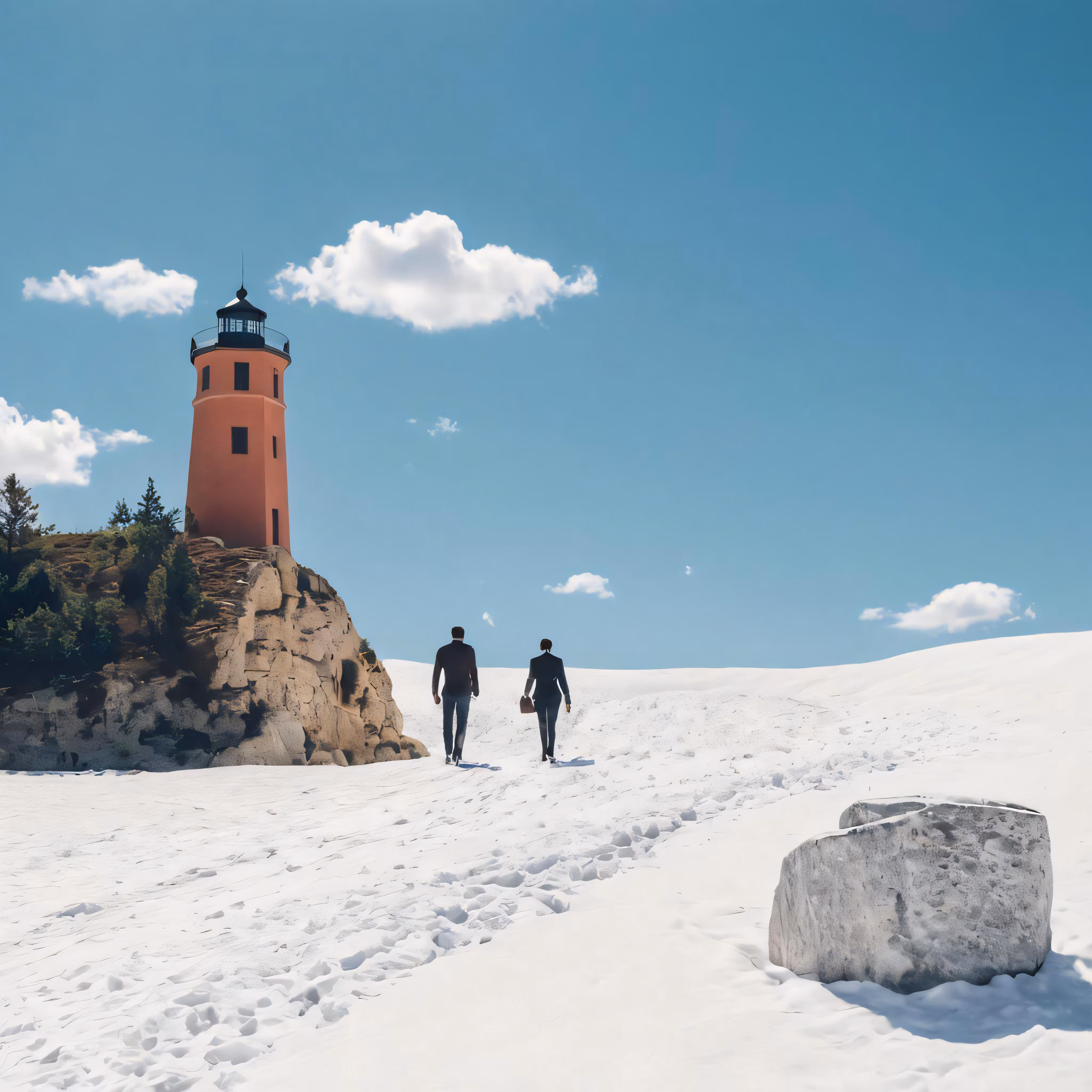 High resolution picture, free to use, two people walking up a snowy path to a tower