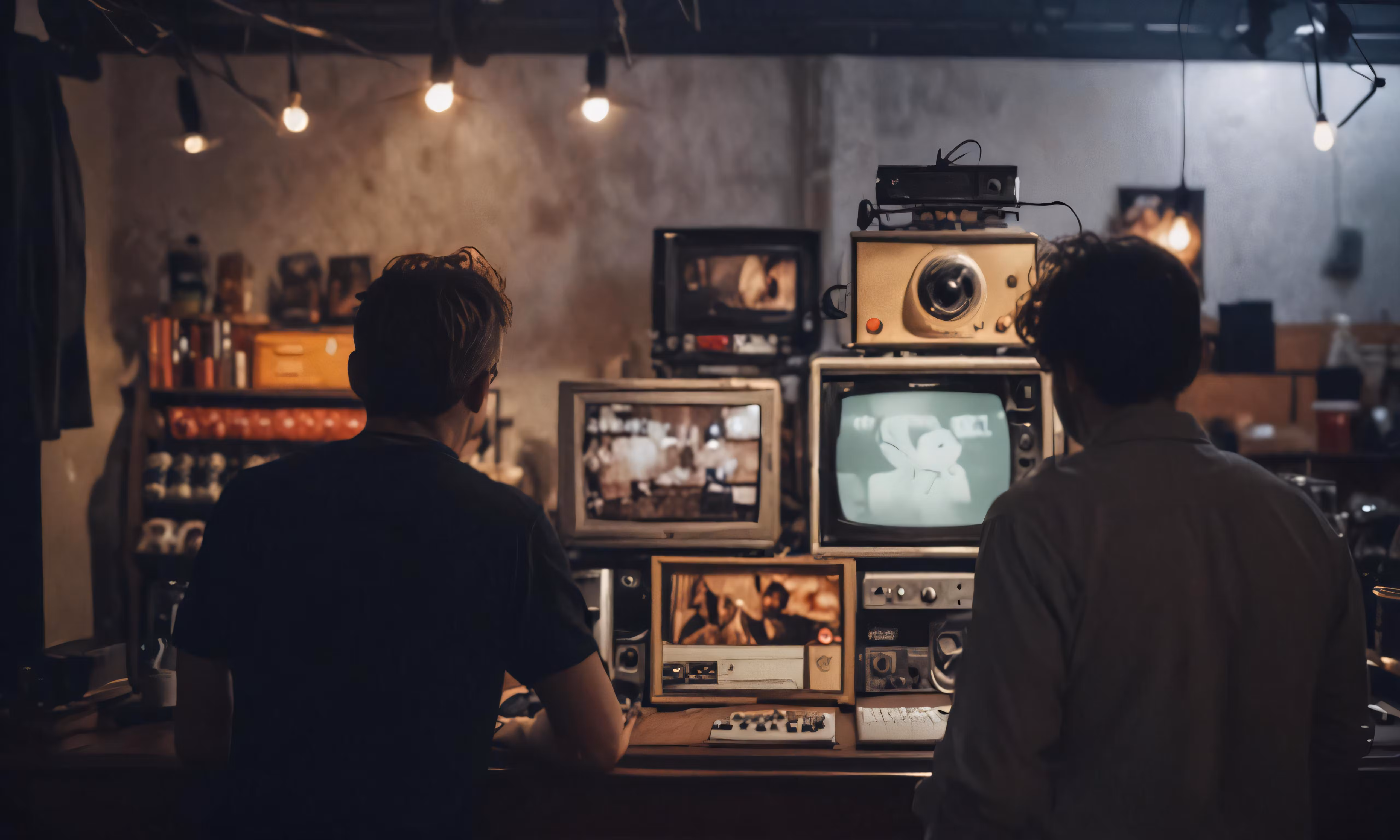 High resolution picture, free to use, two people watching a television set with multiple screen displays