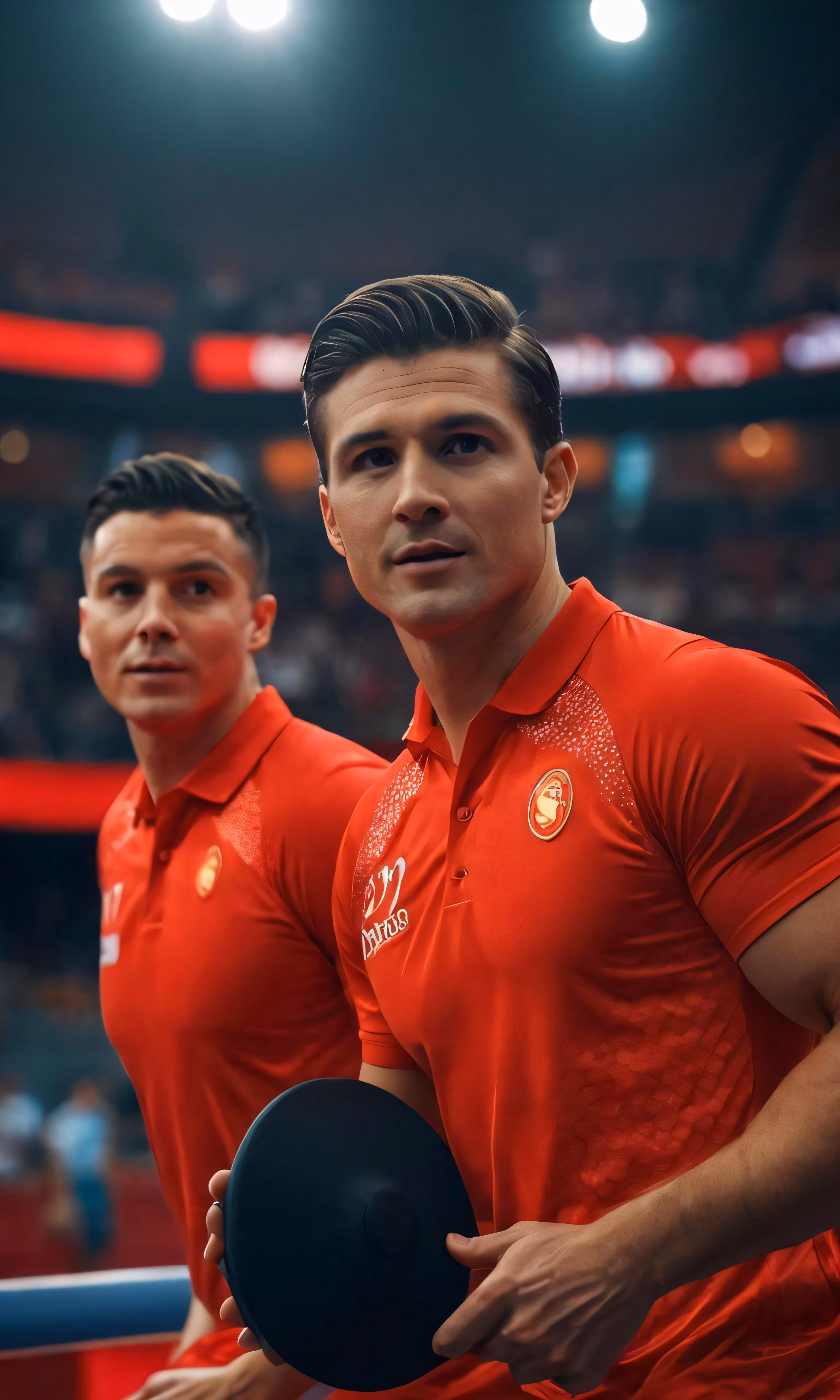 High resolution picture, free to use, two professional athletes holding their trophies on the court