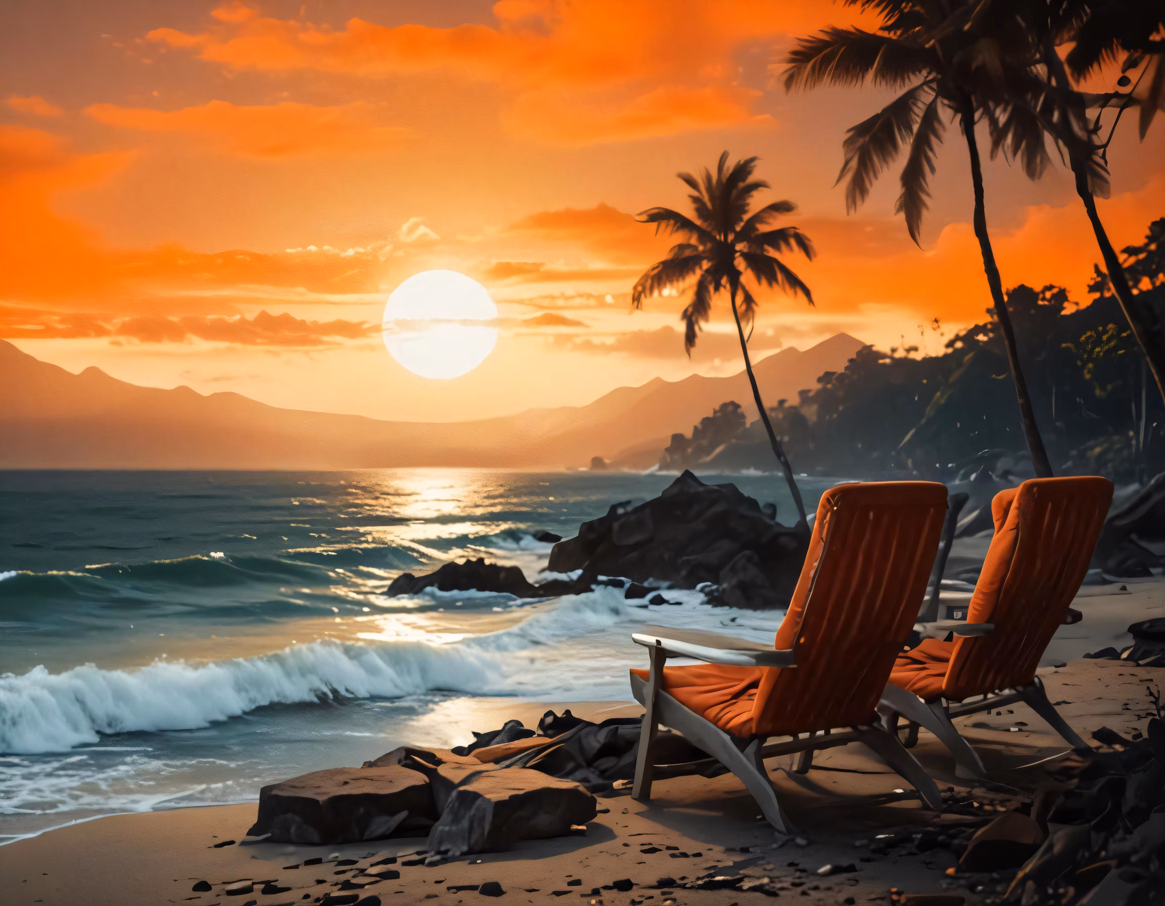 High resolution picture, free to use, two red chairs sitting on top of a beach