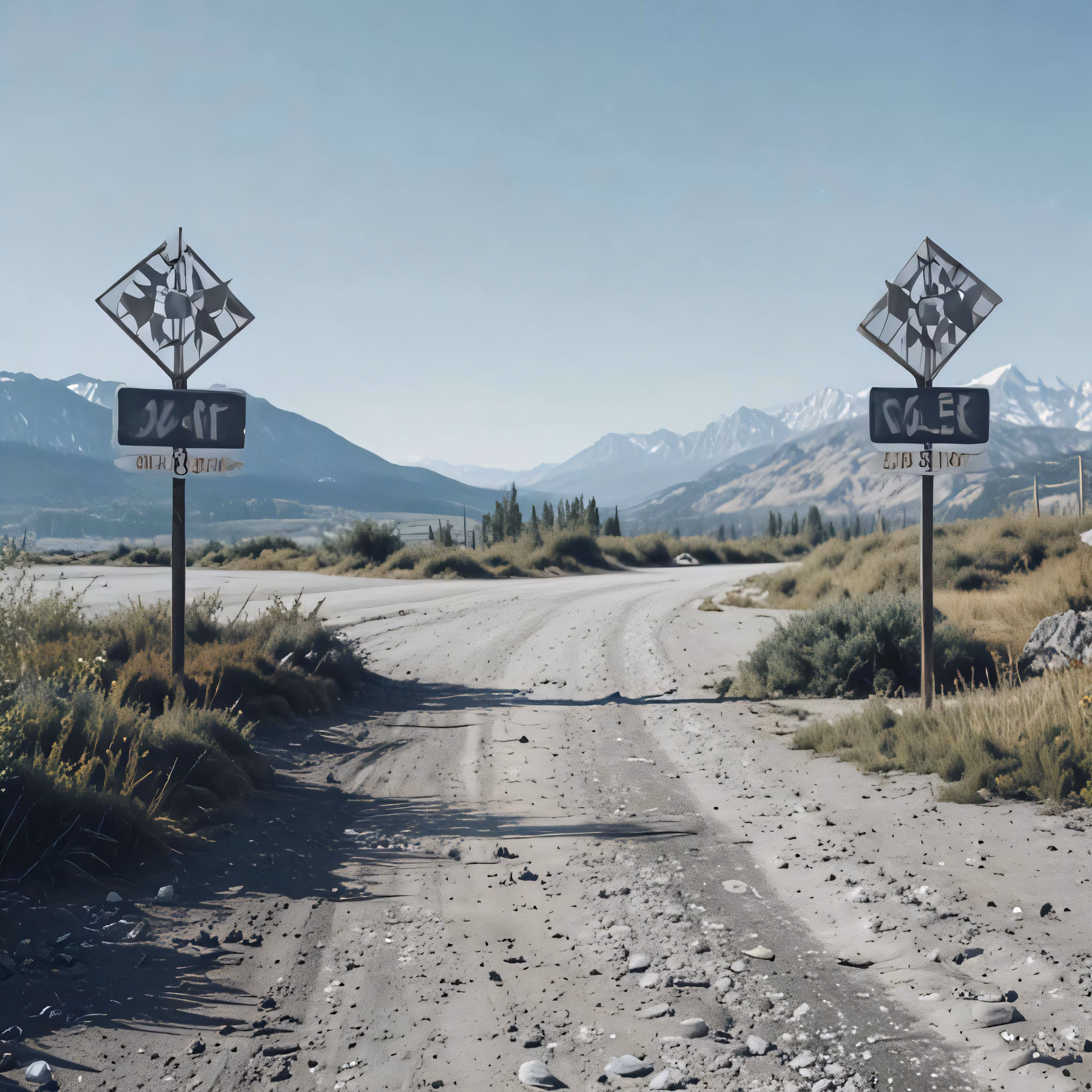 High resolution picture, free to use, two road signs sitting on top of a dirt field