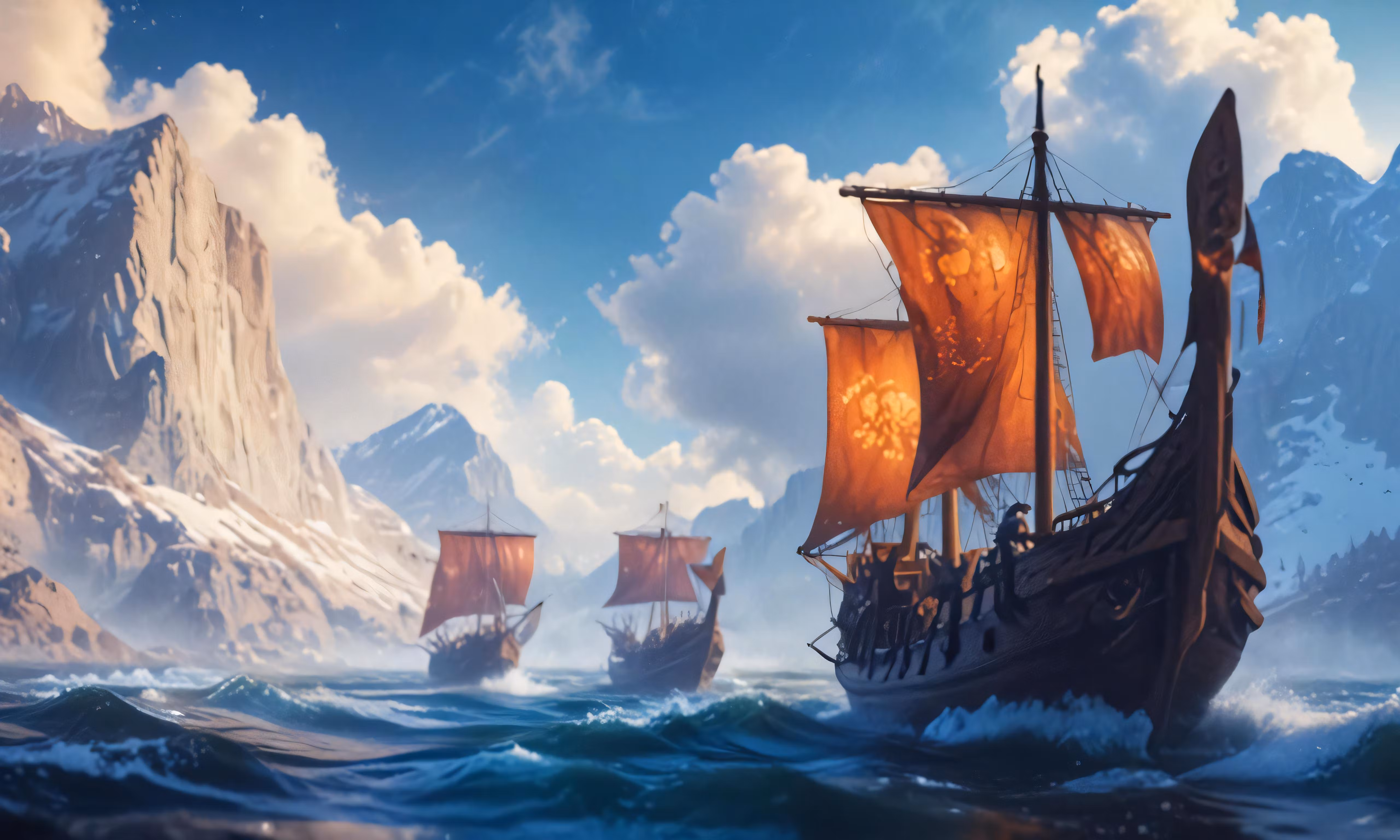 High resolution picture, free to use, two ships sailing in choppy water near mountains