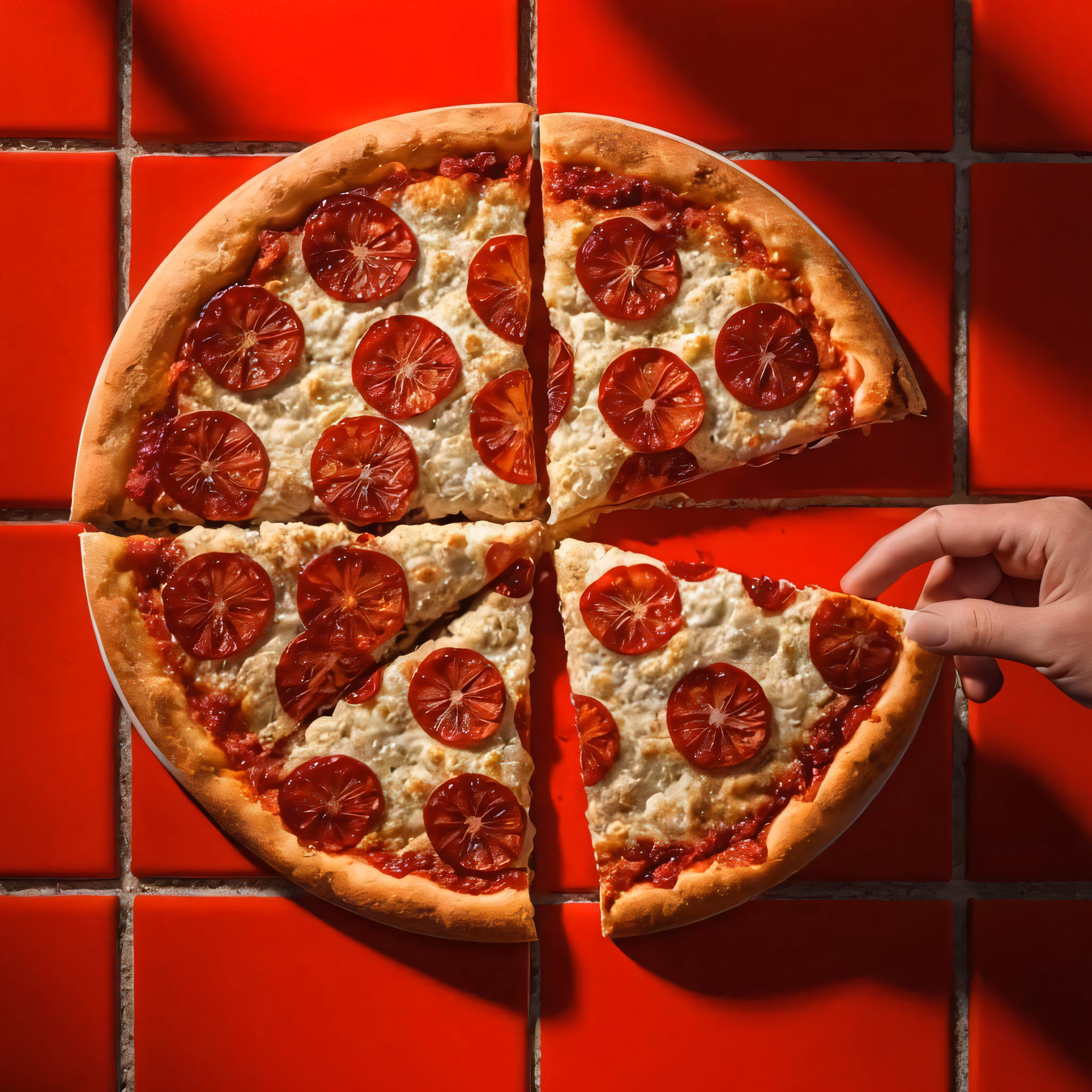 High resolution picture, free to use, two slices of pepperoni pizza on a red table
