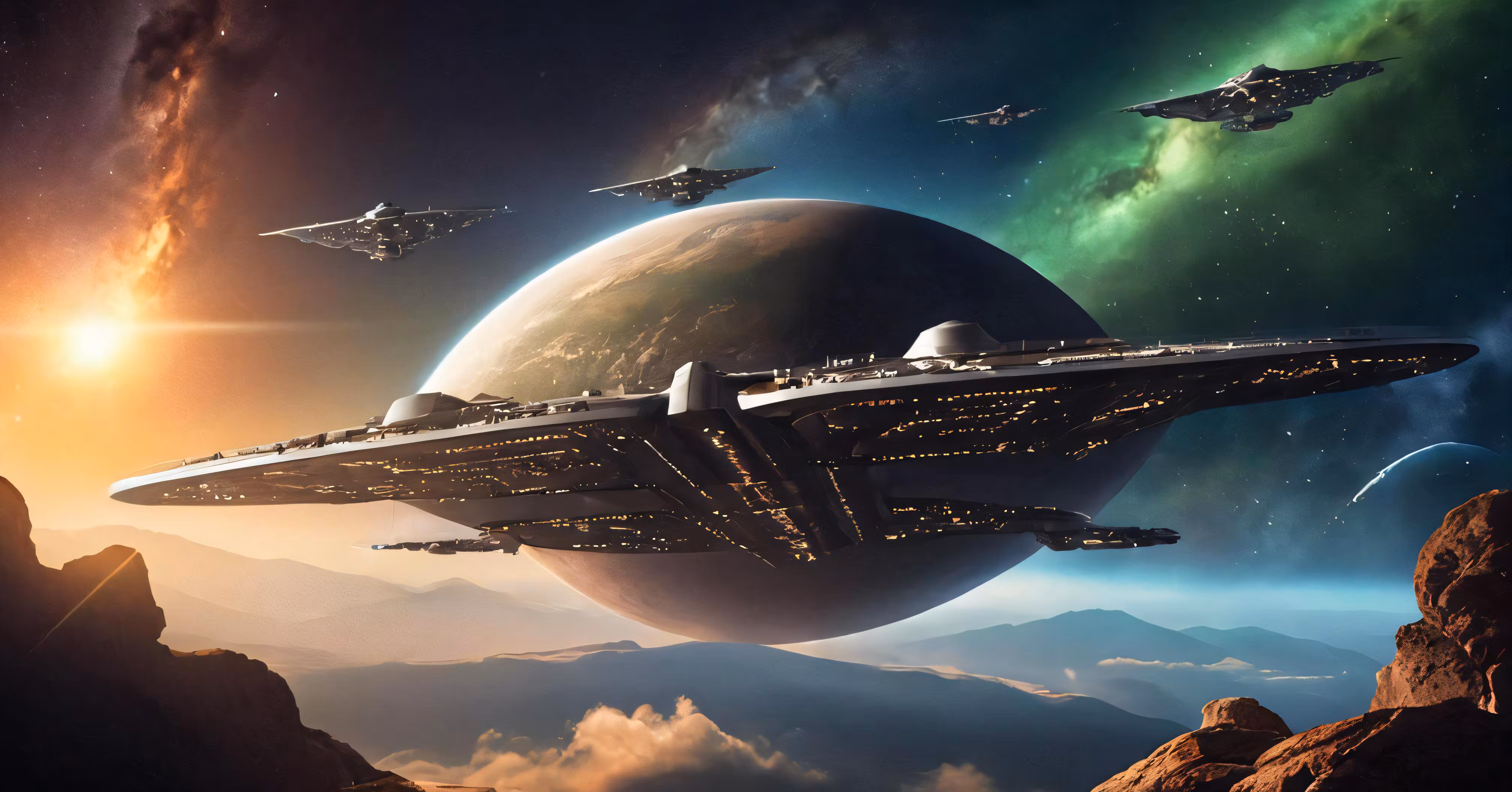 High resolution picture, free to use, two spaceships flying in space above a mountainous area