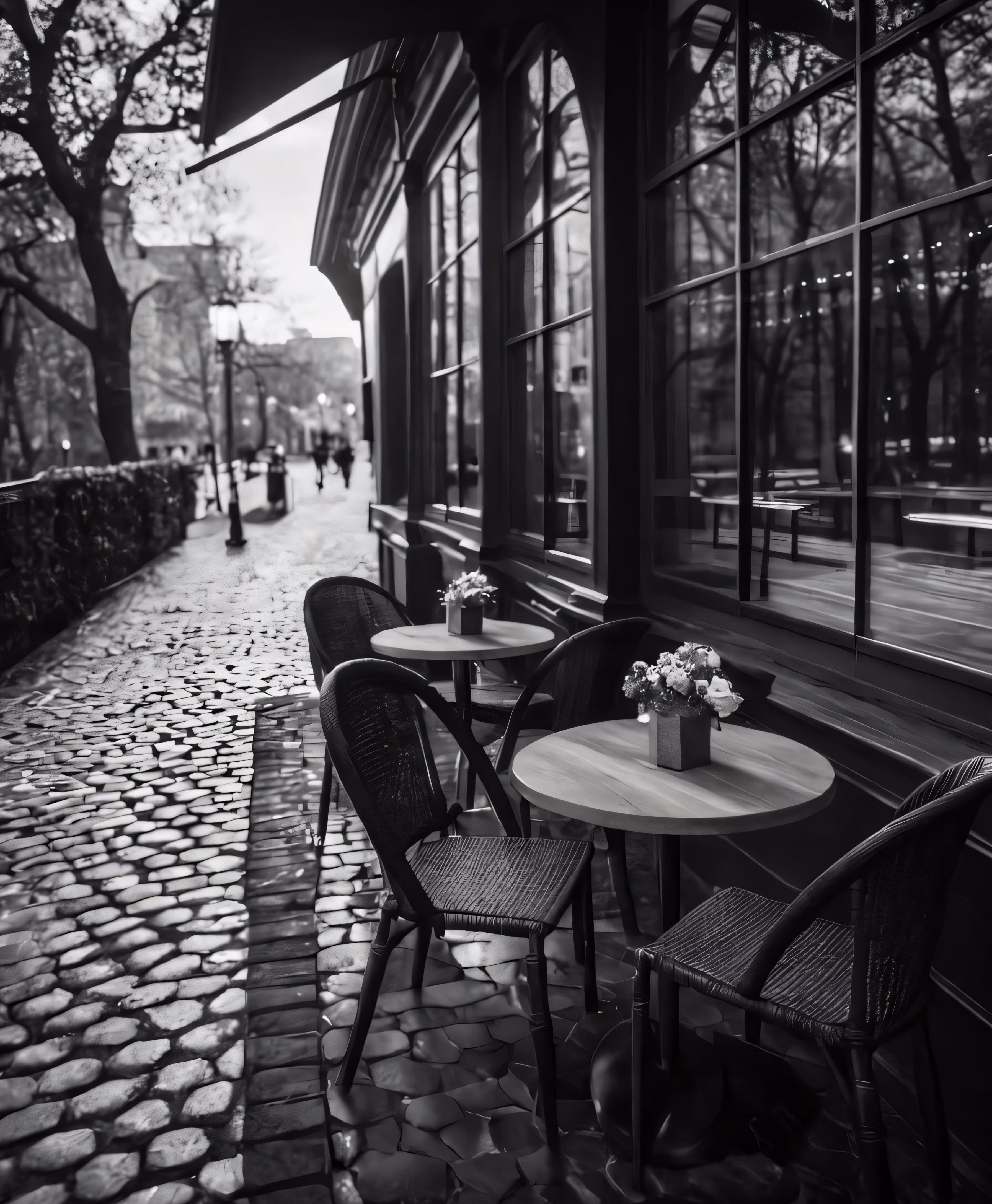 High resolution picture, free to use, two tables on sidewalk next to large windows