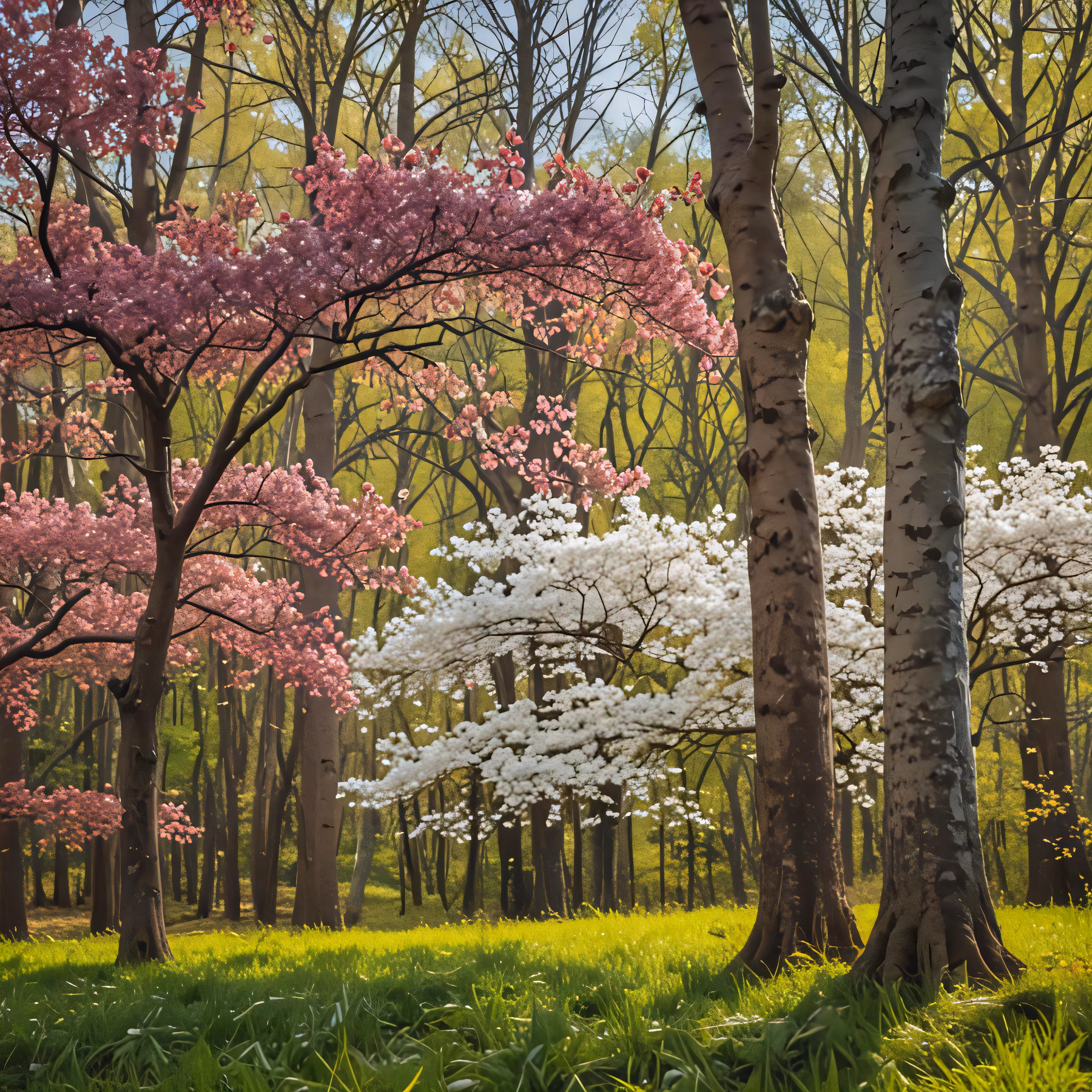 High resolution picture, free to use, two trees in the middle of a grassy field near pink flowers