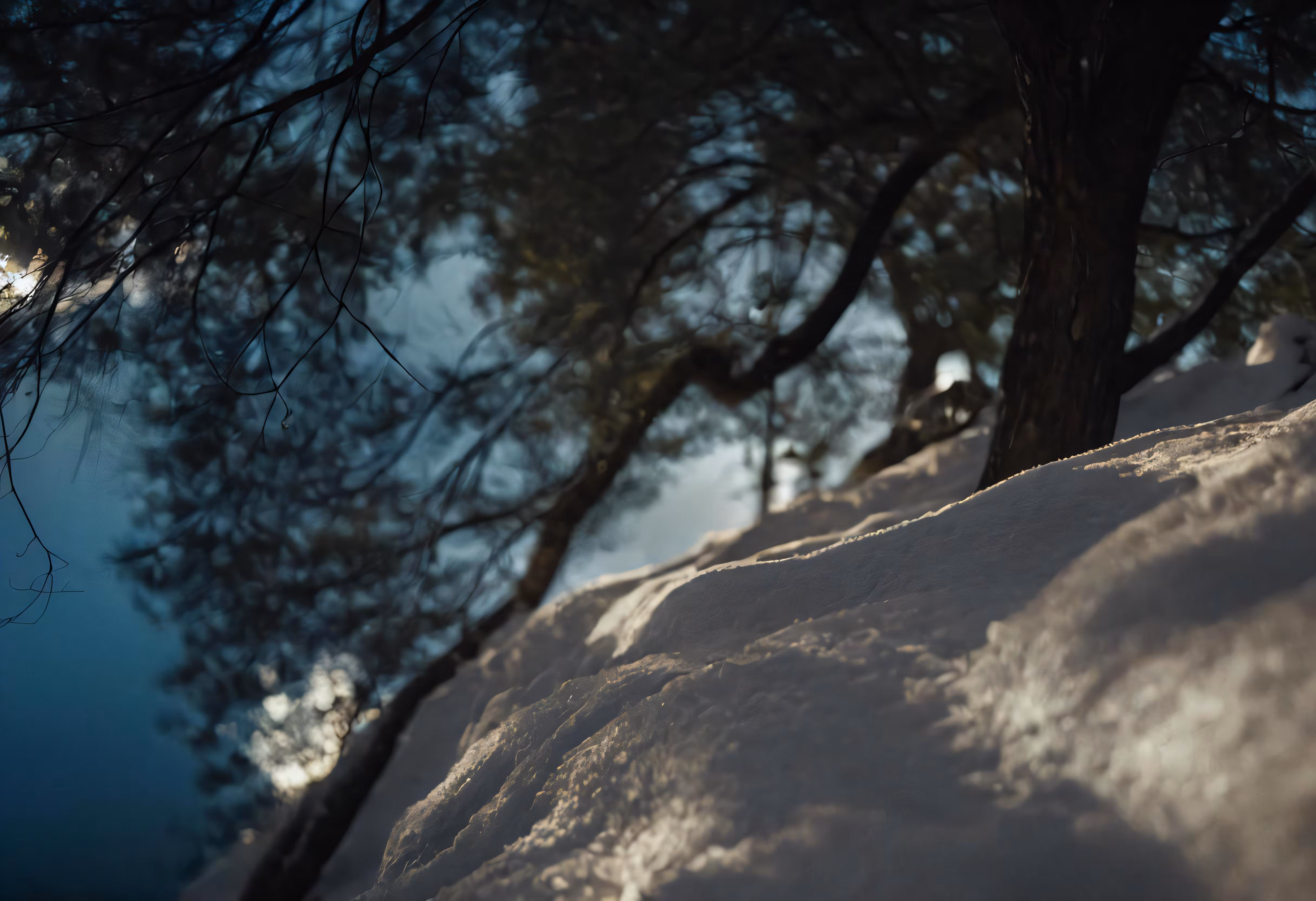 High resolution picture, free to use, two trees standing on the side of a snow covered hill