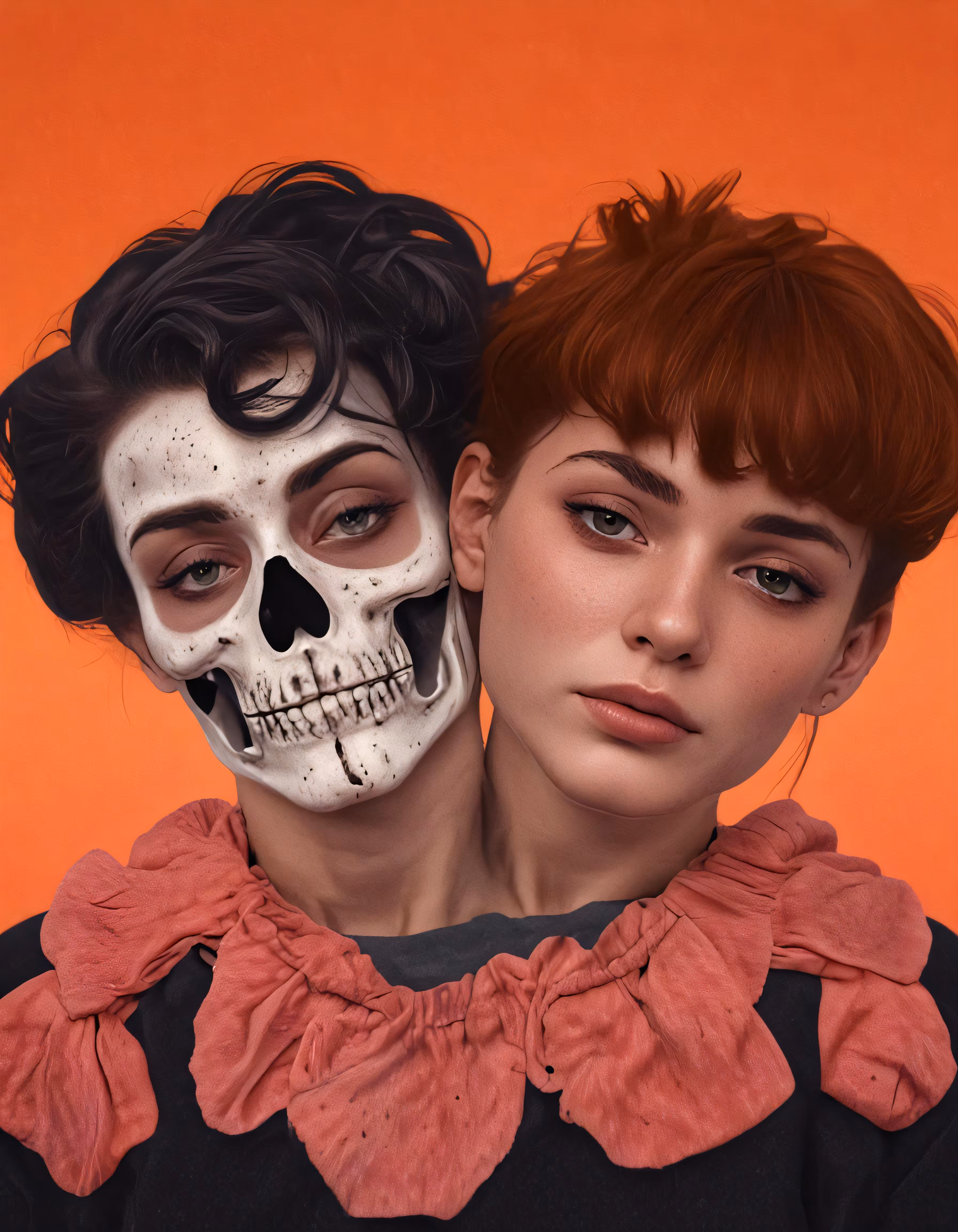 High resolution picture, free to use, two woman with their heads together in skull makeup
