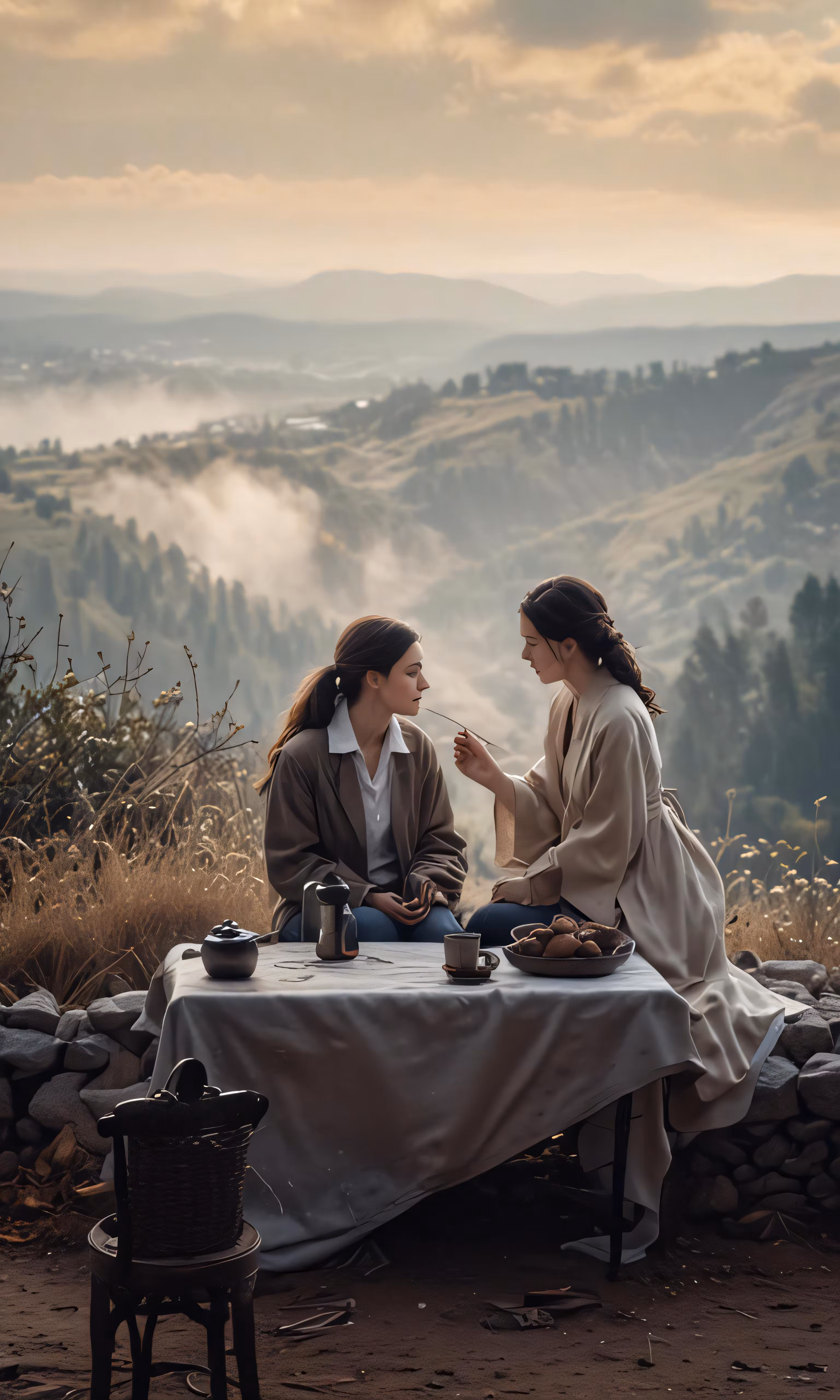 High resolution picture, free to use, two women sitting at a picnic table talking and eating food