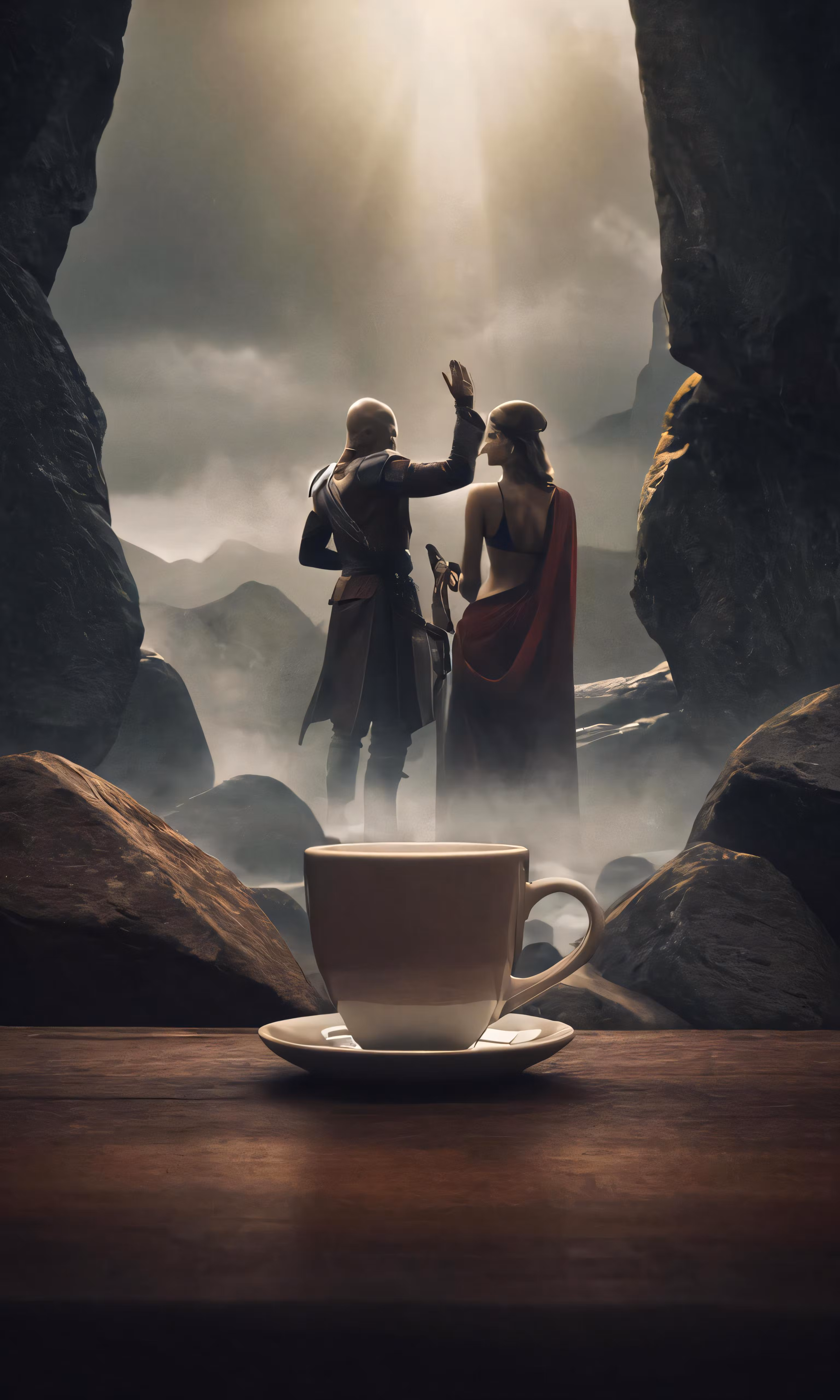 High resolution picture, free to use, two women standing in front of a cave with a cup of tea