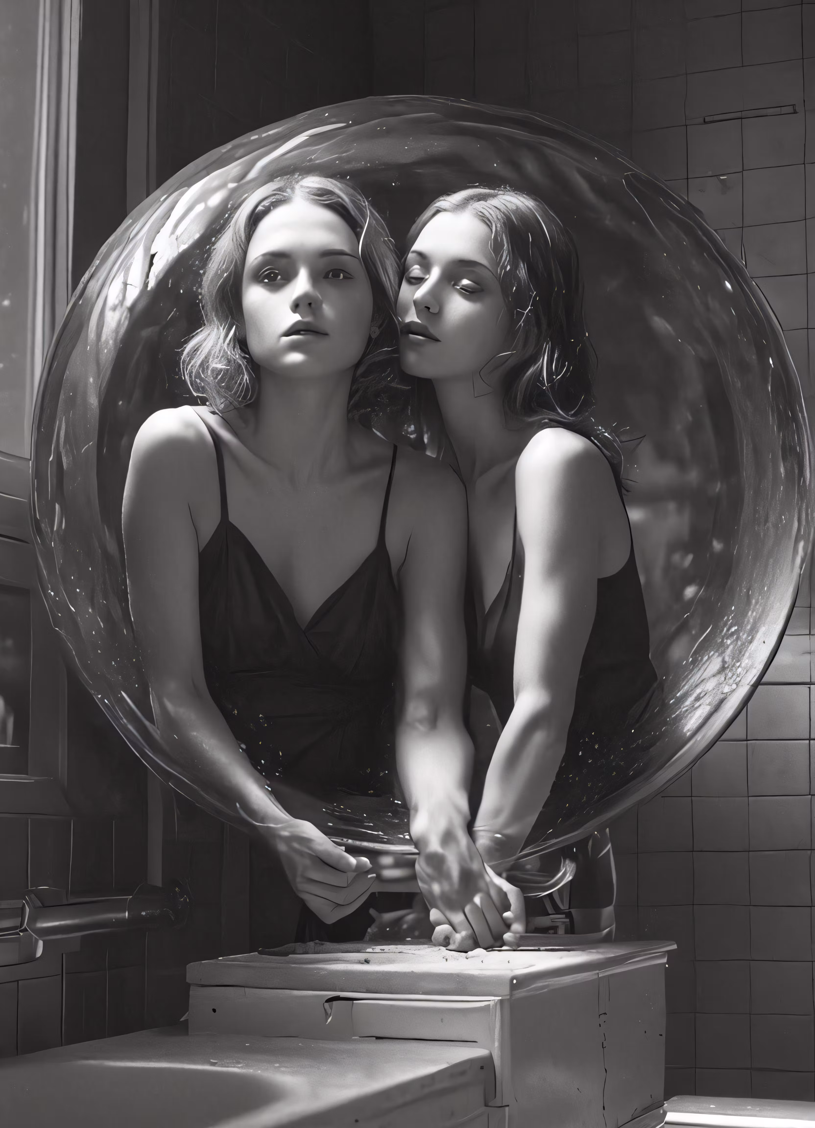 High resolution picture, free to use, two women standing in the mirror taking a selfie