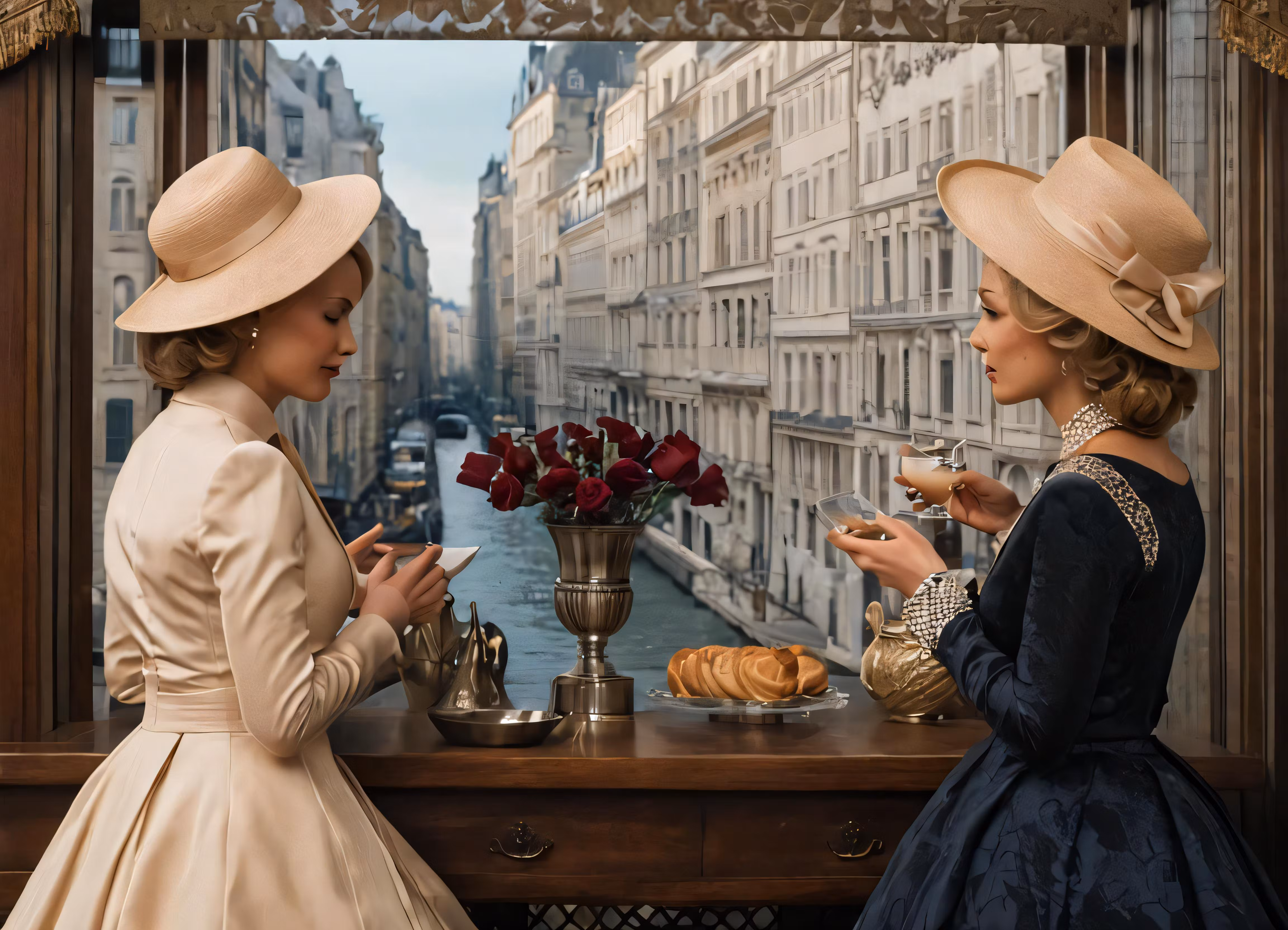 High resolution picture, free to use, two women wearing long dresses are eating at a table