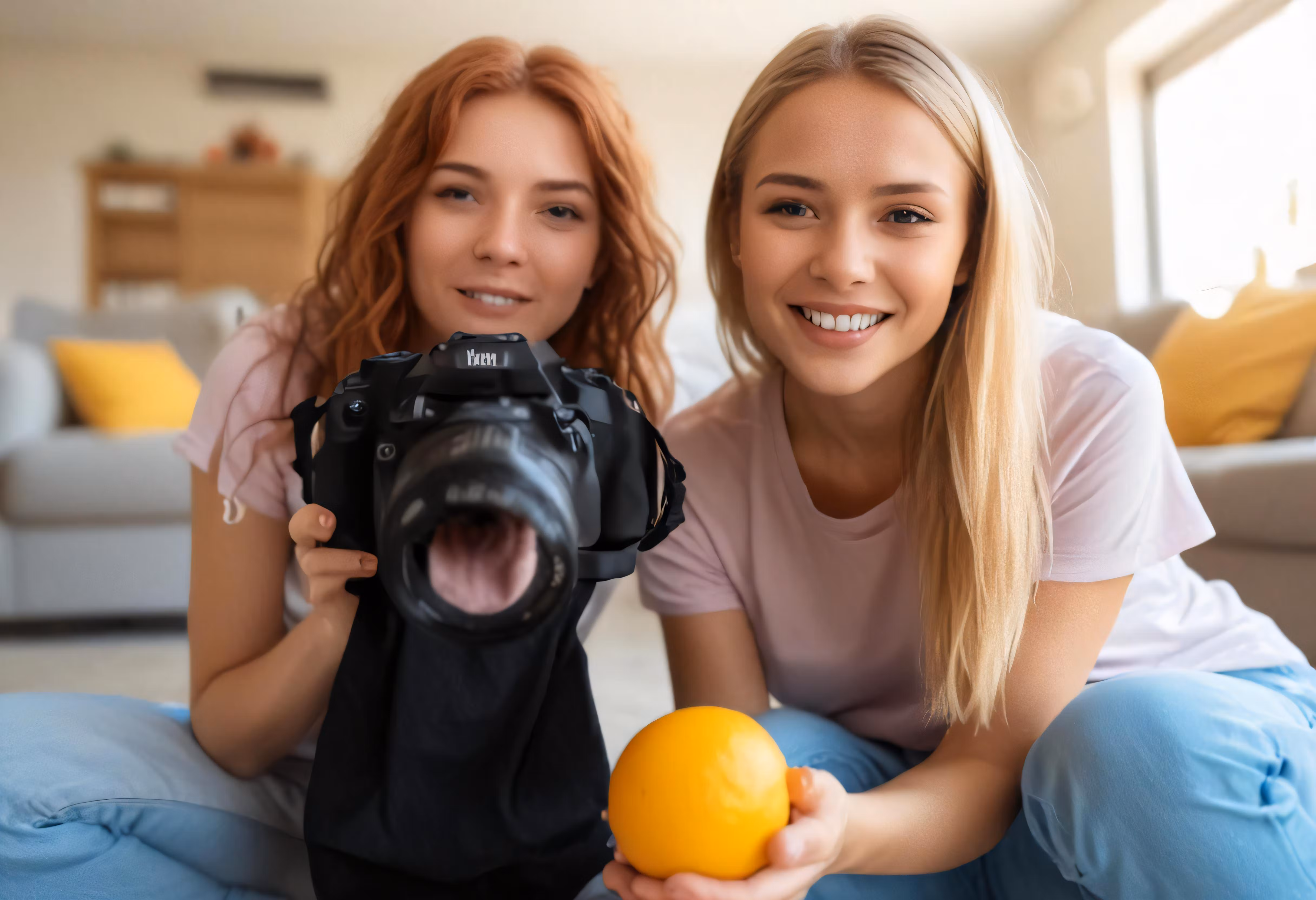 High resolution picture, free to use, two women with oranges and a camera posing for a picture