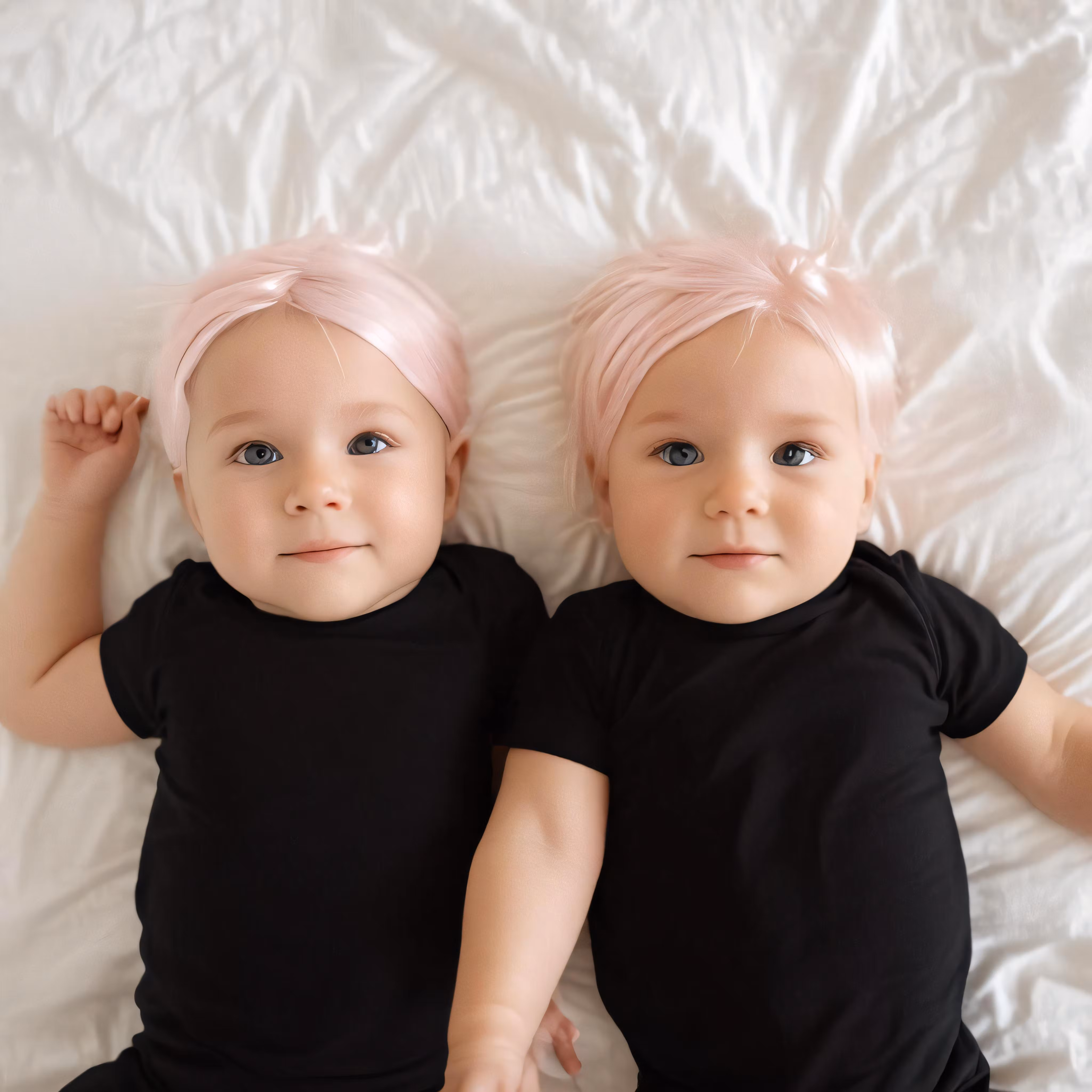 High resolution picture, free to use, two young babies with pink hair laying on a white sheet