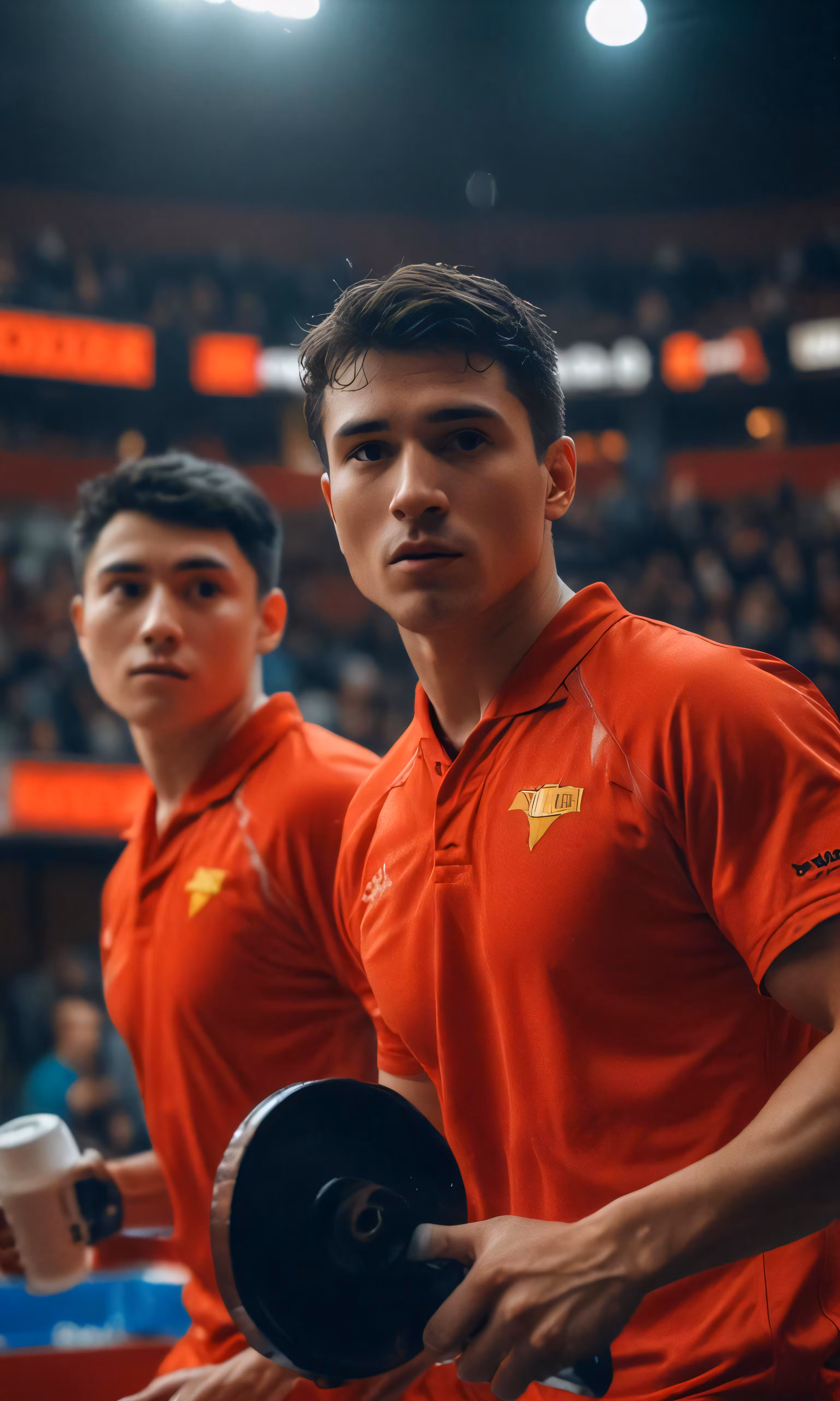 High resolution picture, free to use, two young men wearing red shirts holding their dumbs
