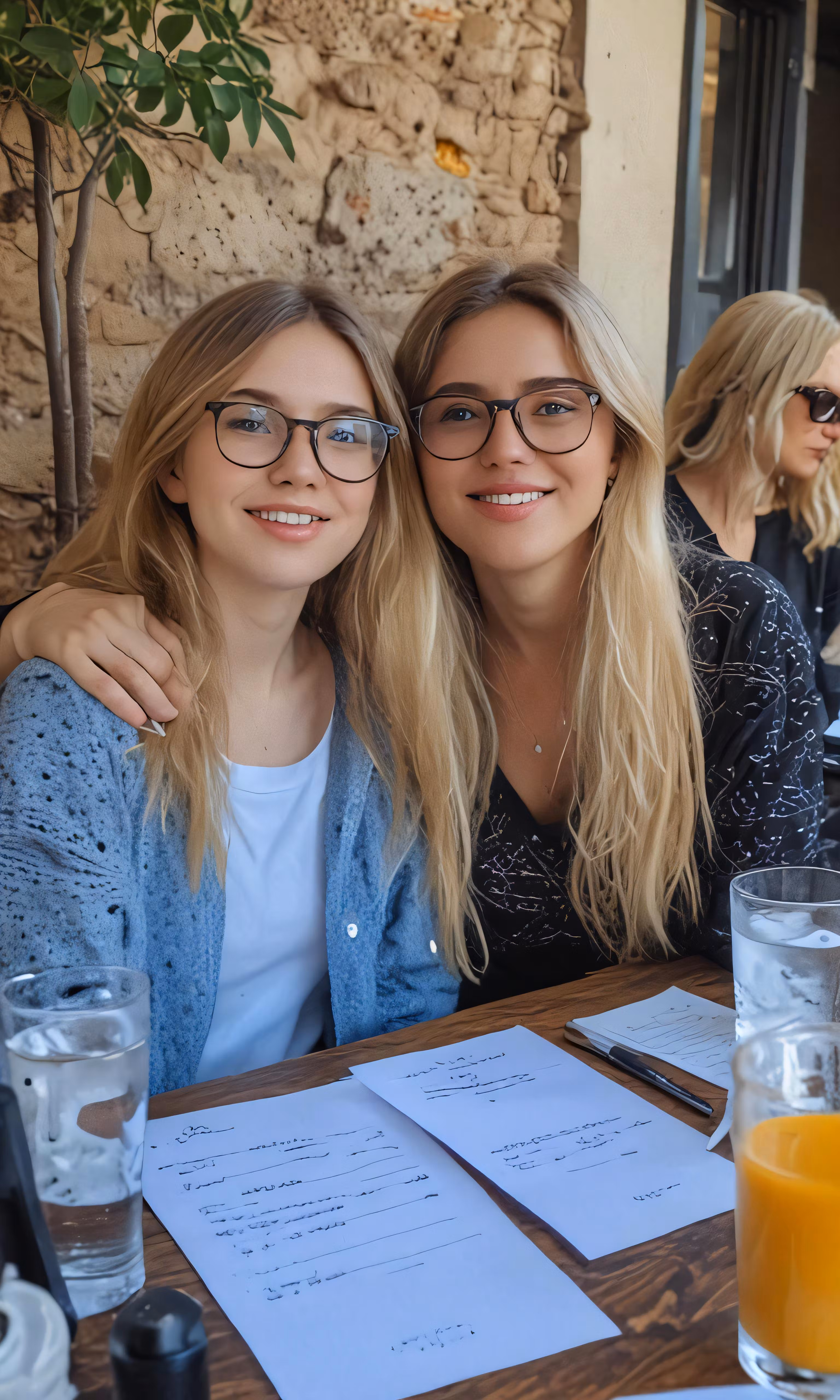 High resolution picture, free to use, two young women smiling while sitting at a restaurant
