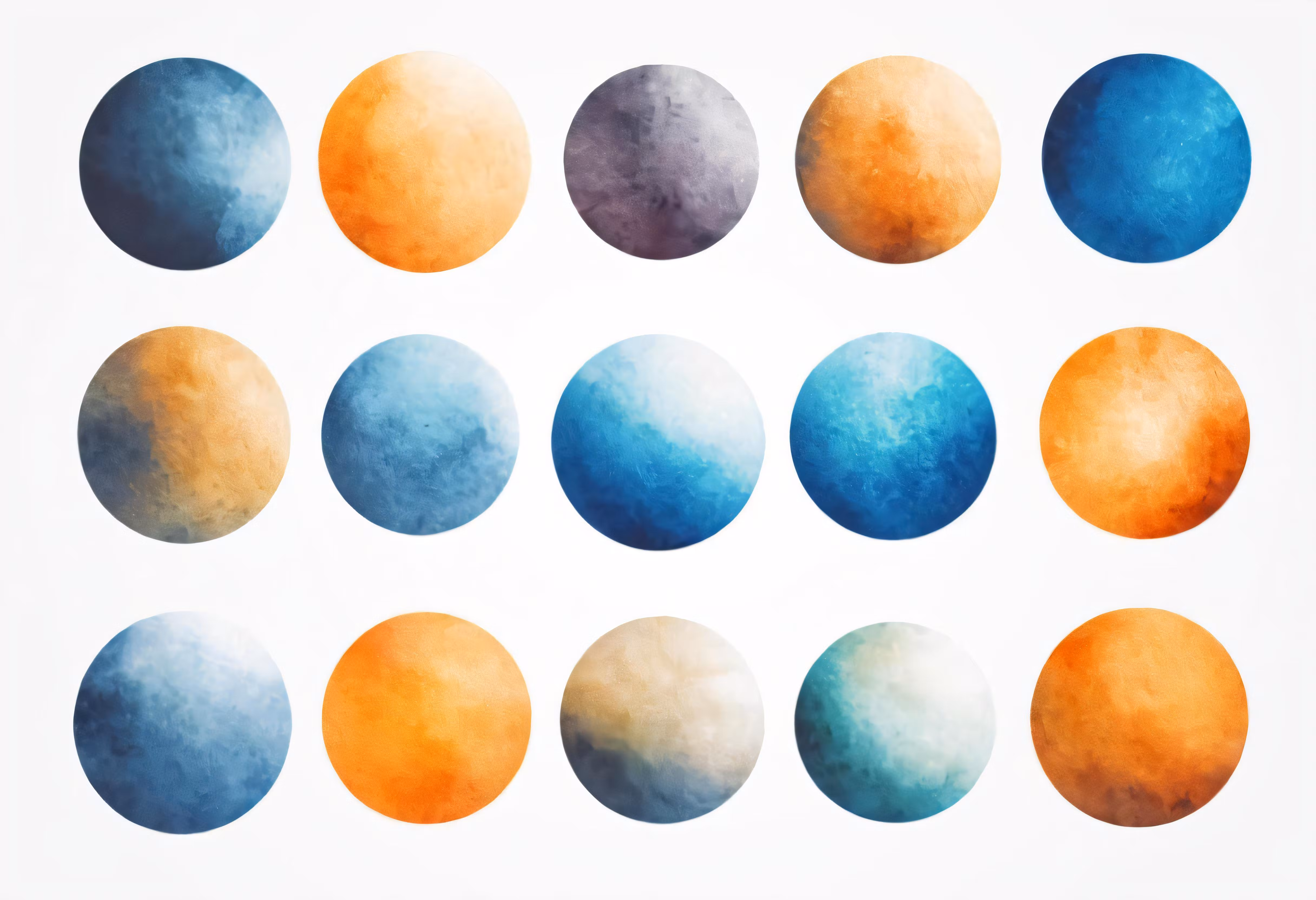High resolution picture, free to use, various orange and blue balls painted with watercolor