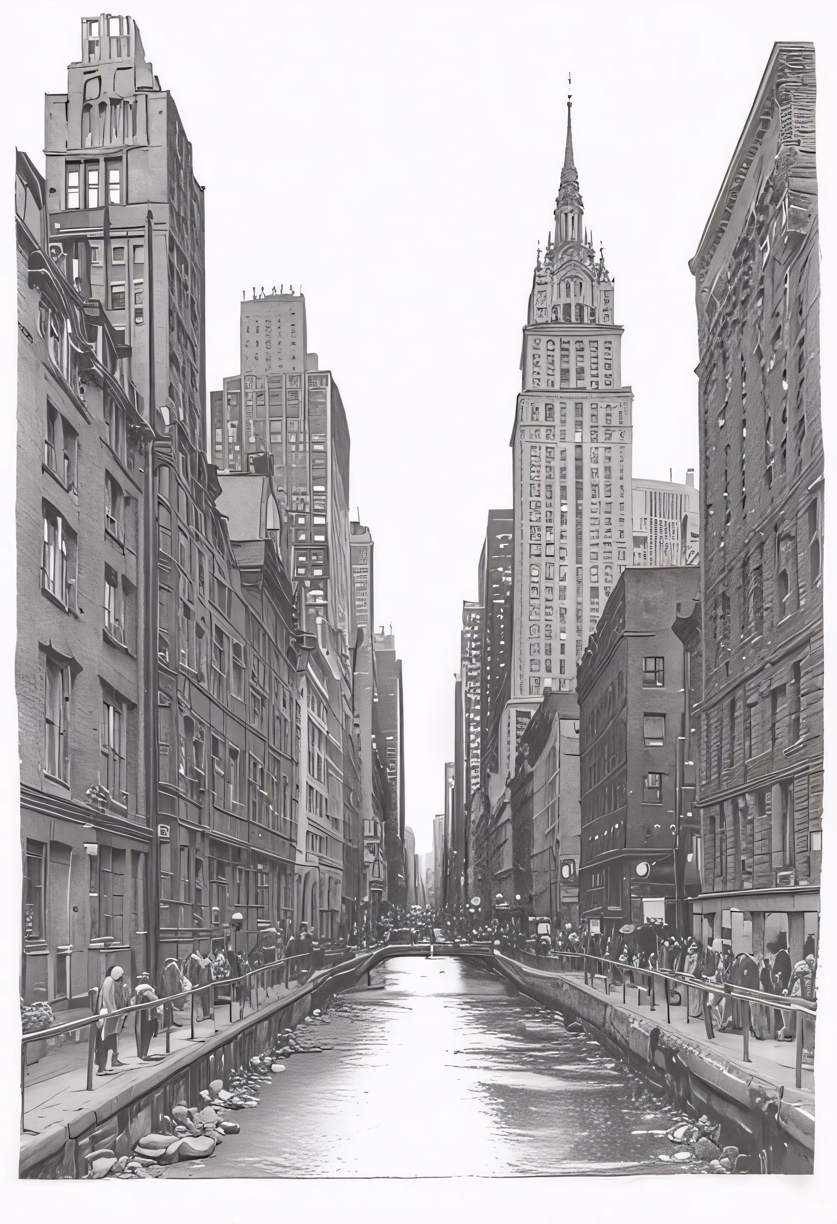 High resolution picture, free to use, view of a canal, buildings, and pedestrians on either side