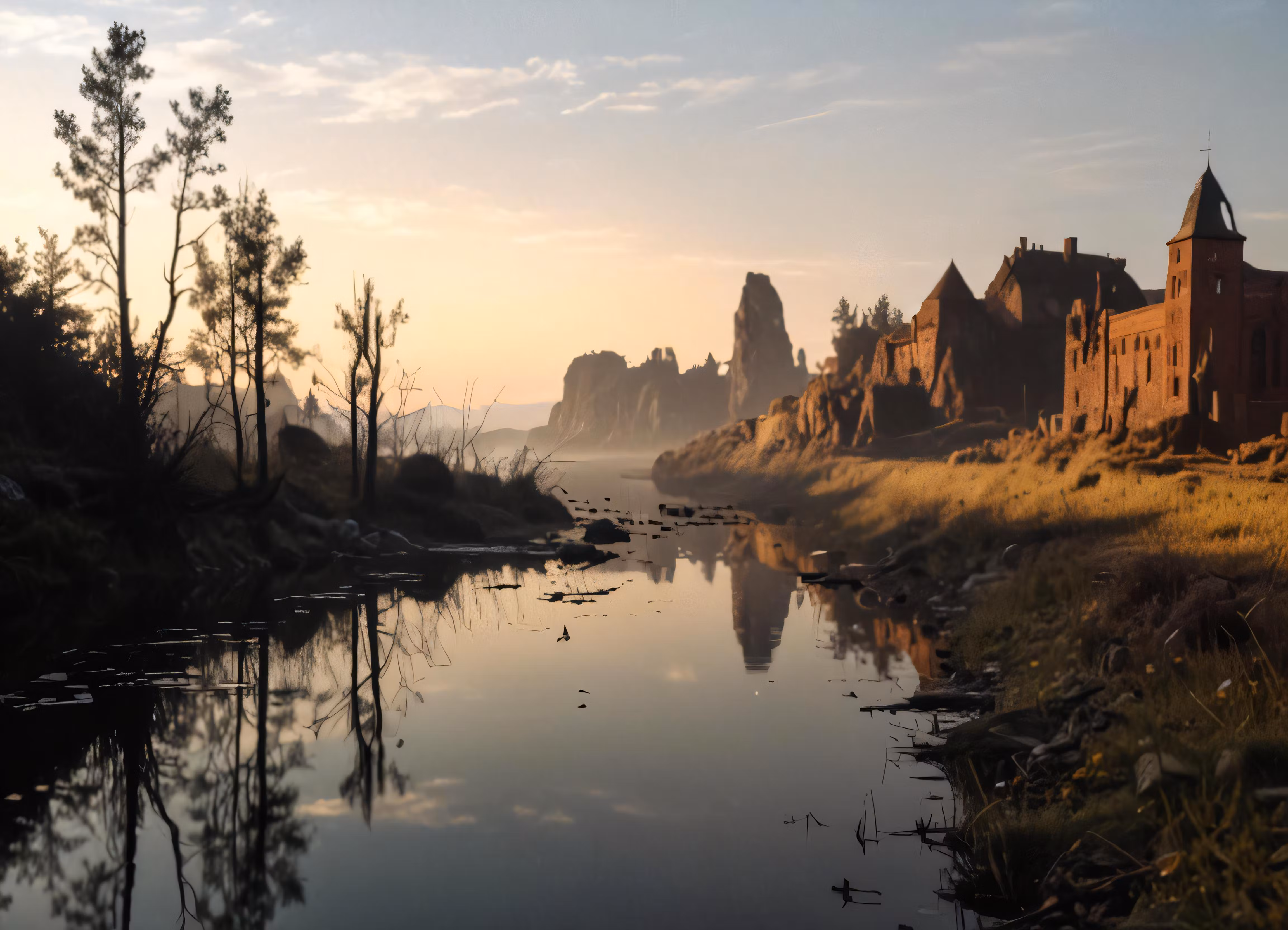 High resolution picture, free to use, water that is calm and in front of a castle